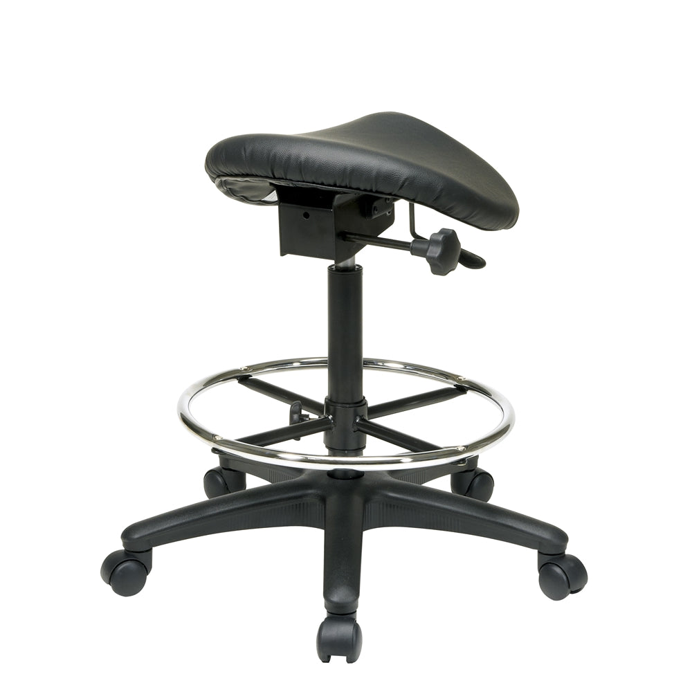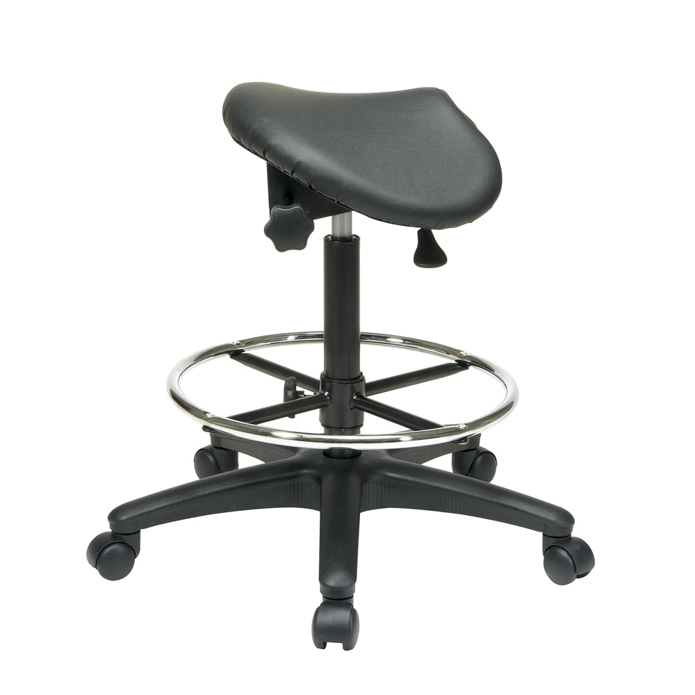 Pneumatic Drafting Chair with Adjustable Foot ring. Backless stool with Seat Saddle Seat and Seat Angle Adjustment. Height Adjustment 25" to 35" overall.
