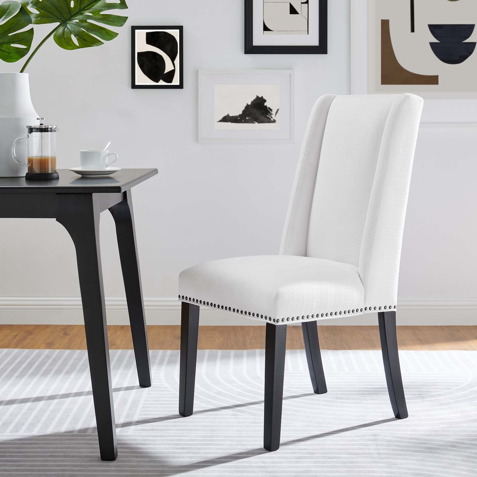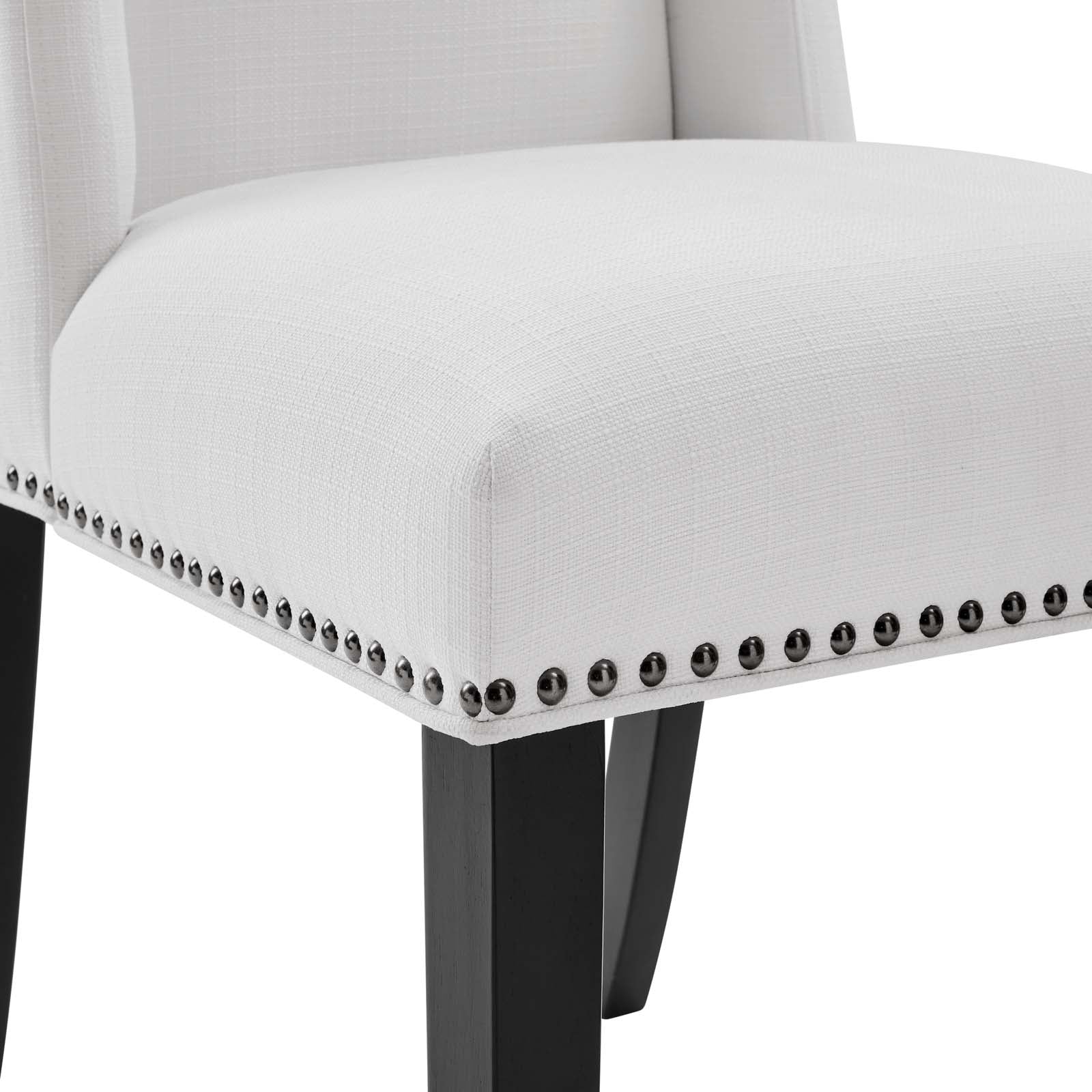 Explore the vast riches of a treasured heritage with the Baron Dining Chair. Designed to resonate elegance, Barons features a charming back and polished nailhead trimmed seat with a dash of grace and noble appeal. Complete with dense foam padding, fine fabric upholstery, solid wood frame and legs with non-marking foot glides, Baron is a stylish dining chair perfect for the modern home. Set Includes: Two - Baron Dining Chair