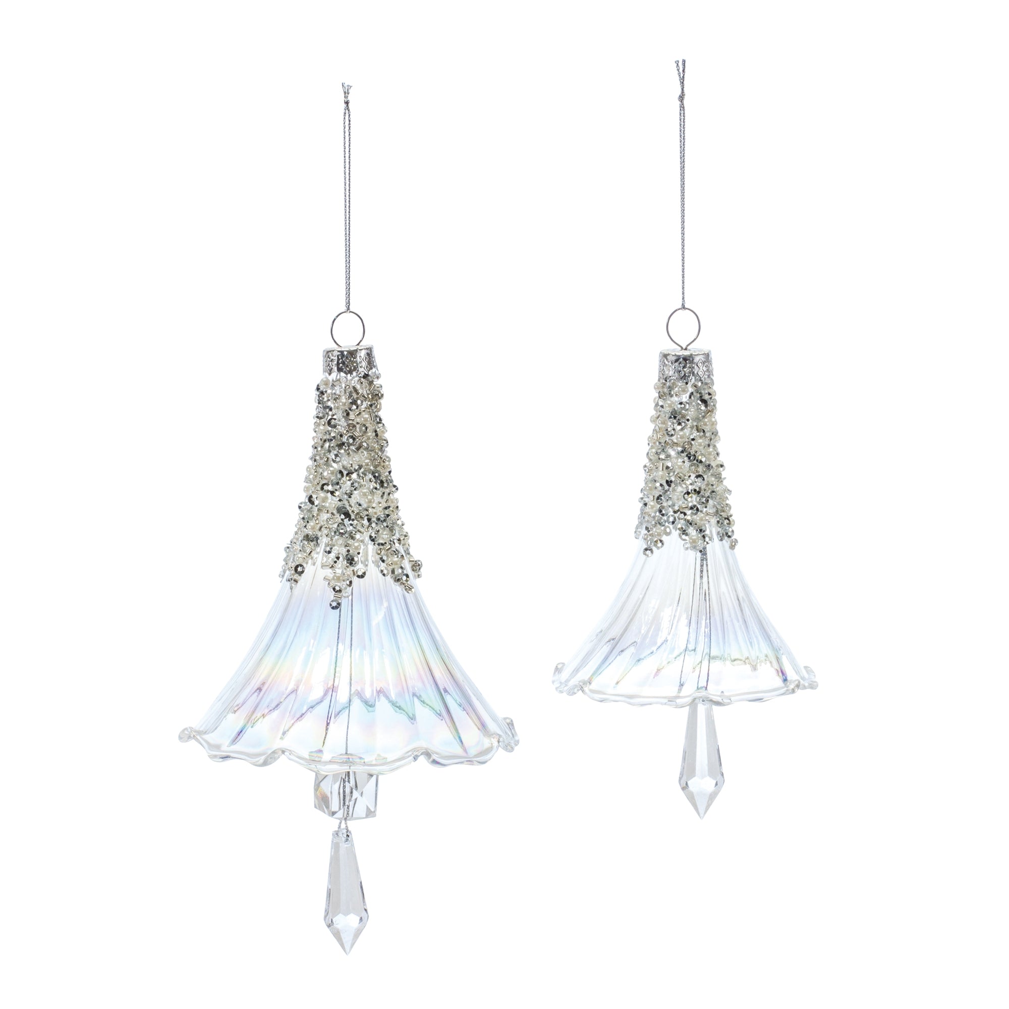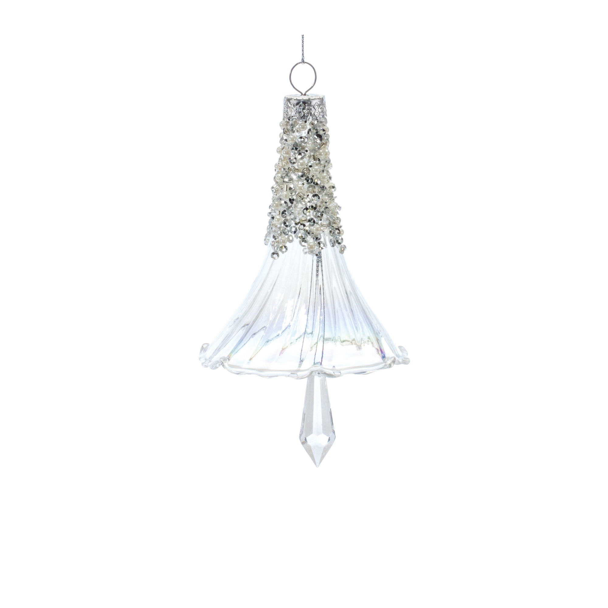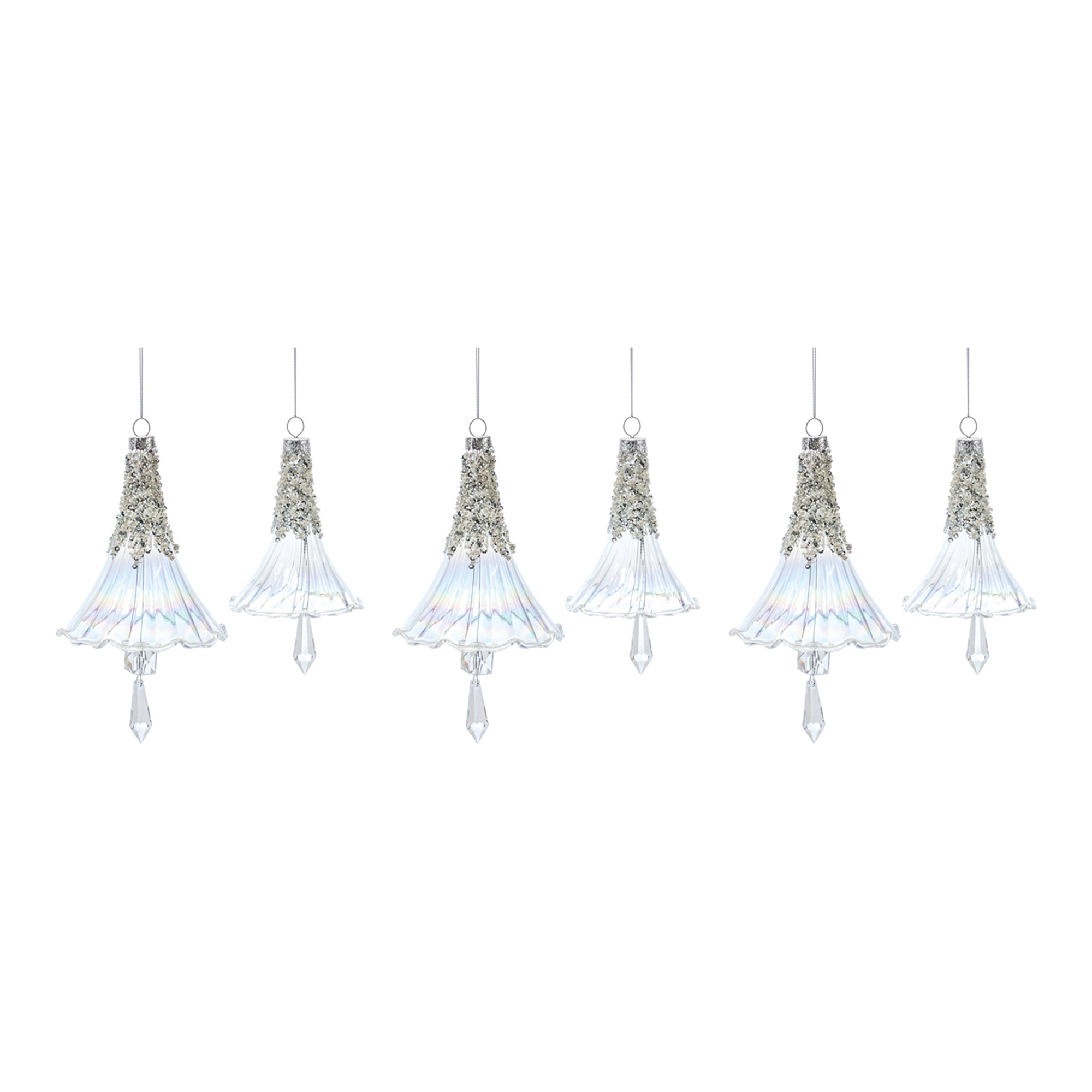 Adorn your Christmas tree and holiday decor with this stunning set of Beaded Irredescent Glass Bell Ornaments. Featuring 6 pieces, the wintry white and chic silver tones paired with the irredescent design is the perfect combination to create a memorable display. The quality glass composition and delicate silver sting hanging accent is sure to endure for seasons to come. Whether you're adding a touch of cheer to your home or gifting to a loved one, these ornaments will definitely bring smiles. , Ornament (Set of 6) 5.25"H, 7.25"H Glass