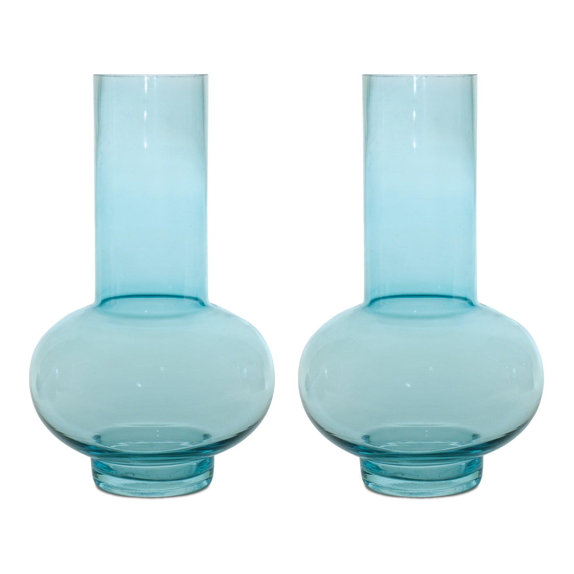 Transform your home decor with a modern touch and bring the outdoors in with this stunning set of Glass Vases! Crafted from high-quality glass with a sleek, mid-century design, this beautiful set will add a cool blue touch to any room. Whether you arrange fresh garden picks or display it solo, it's sure to become an eye-catching centerpiece in your home. Get yours today and enjoy the stunning style of the Glass Vases!, Vase (Set of 2) 7"D x 11.75"H Glass