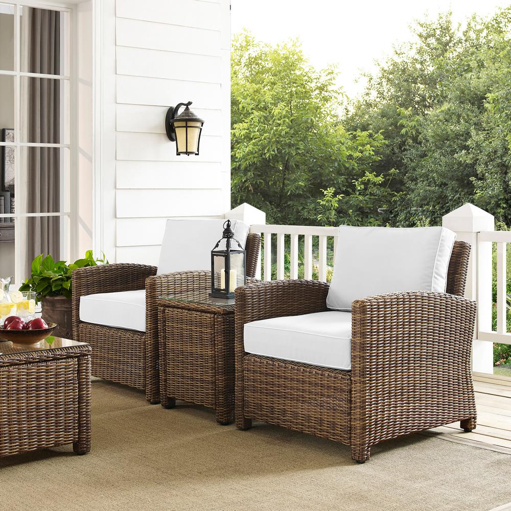 Bradenton 3Pc Outdoor Wicker Armchair Set - Sunbrella White/Weathered Brown - Side Table & 2 Armchairs
