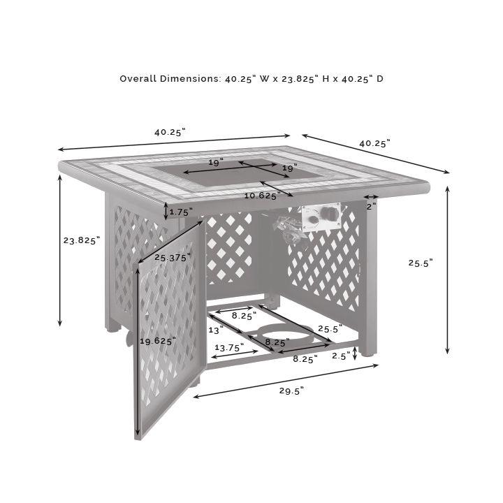 Gather around the fire for a relaxing evening with the Bradenton 5pc Conversation Set. Four all-weather resin wicker armless chairs surround a powder-coated steel fire table, for cozy outdoor entertaining. Each chair features back and seat cushions covered in a solution-dyed polyester providing durability and comfort. The fire table's tiled stone top and lattice panel base offer a unique design that complements a variety of outdoor spaces. The gas controls and a rack for a propane tank are located inside the table's base, keeping them close at hand but out of sight. You'll be ready to relax in comfort with the Bradenton conversation set.