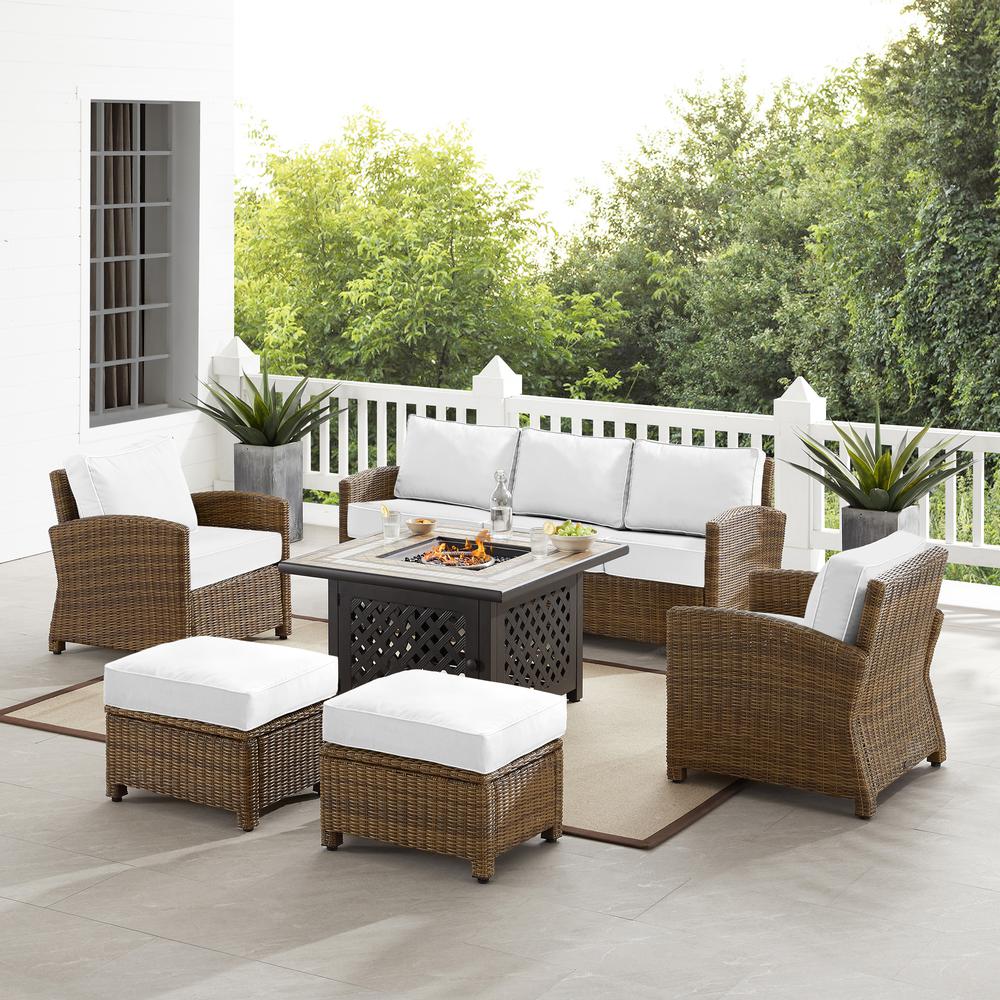 Bradenton 6Pc Outdoor Sofa Set W/Fire Table - Sunbrella White/Weathered Brown - Tucson Fire Table, Sofa, 2 Armchairs & 2 Ottomans