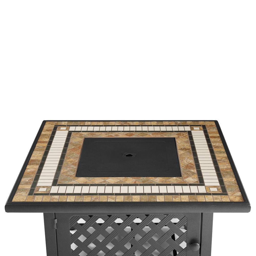 Spend warm summer days and cool summer nights with the Bradenton 6Pc Sofa Set with fire table. The sofa, armchairs, and ottomans are made from all-weather resin wicker with cushions covered in solution-dyed polyester. Constructed from sturdy powder-coated steel, the fire table offers a place to rest your drink or warm your hands. The tiled stone top and included lid create a larger tabletop when the fire component is not needed. Controls for the gas and a rack for a propane tank are located inside the table's lattice panel base, keeping them close at hand but out of sight. Relax in comfort with the Bradenton 6pc Sofa Set.