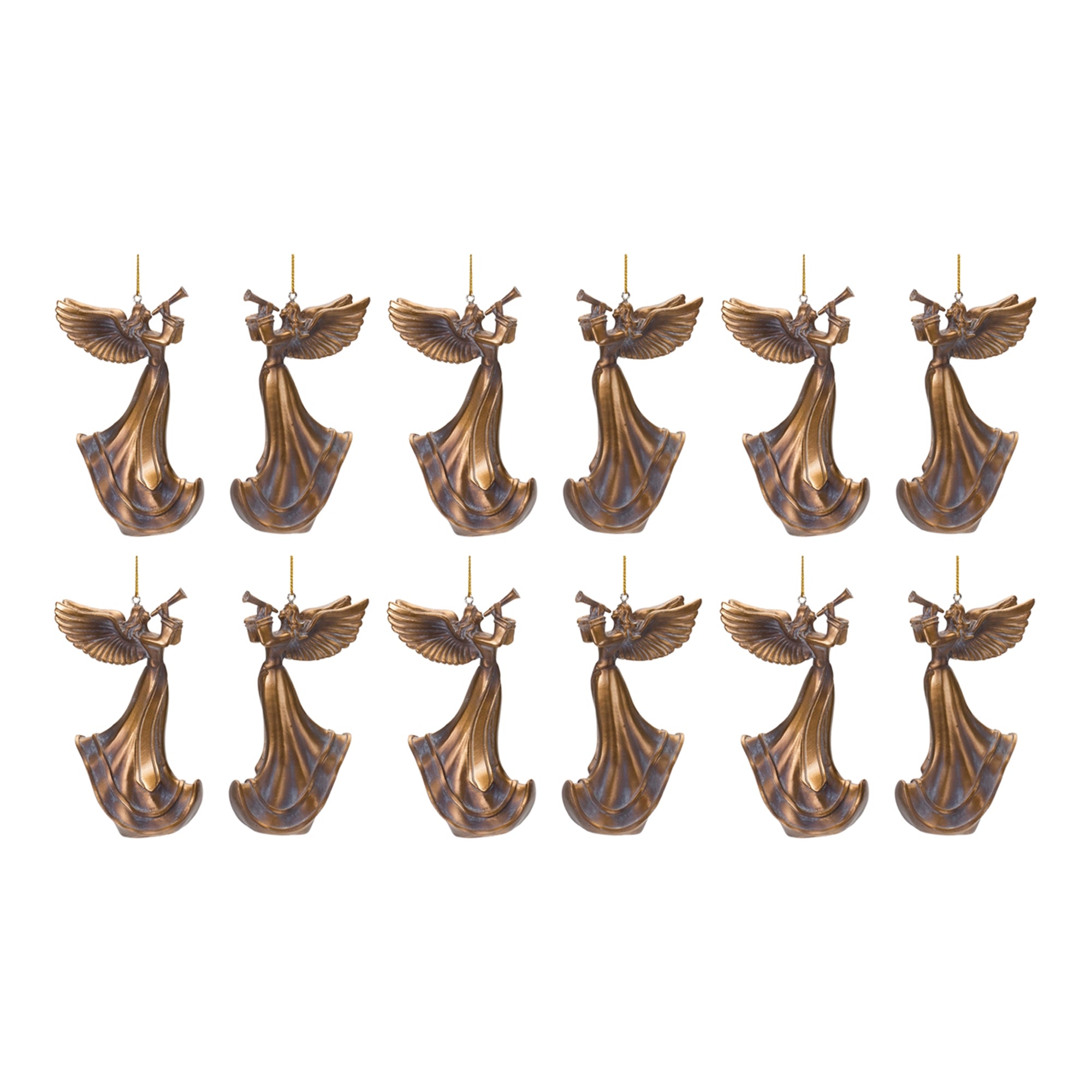 Add a religious touch to your Christmas Tree with this beautiful set of Bronze Trumpet Angel Ornaments. Featuring 6 pieces, this set's chic bronze tones, traditional angel playing a trumpet design, and disressed finish accent are the perfect combination to create a memorable display. The quality iron metal composition with delicate jute string hanger is sure to endure for seasons to come. Whether you're adding a touch of cheer to your home or gifting to a loved one, these ornaments will definitely bring smiles to your home. , Angel w/Horn Ornament (Set of 6) 5"H Resin