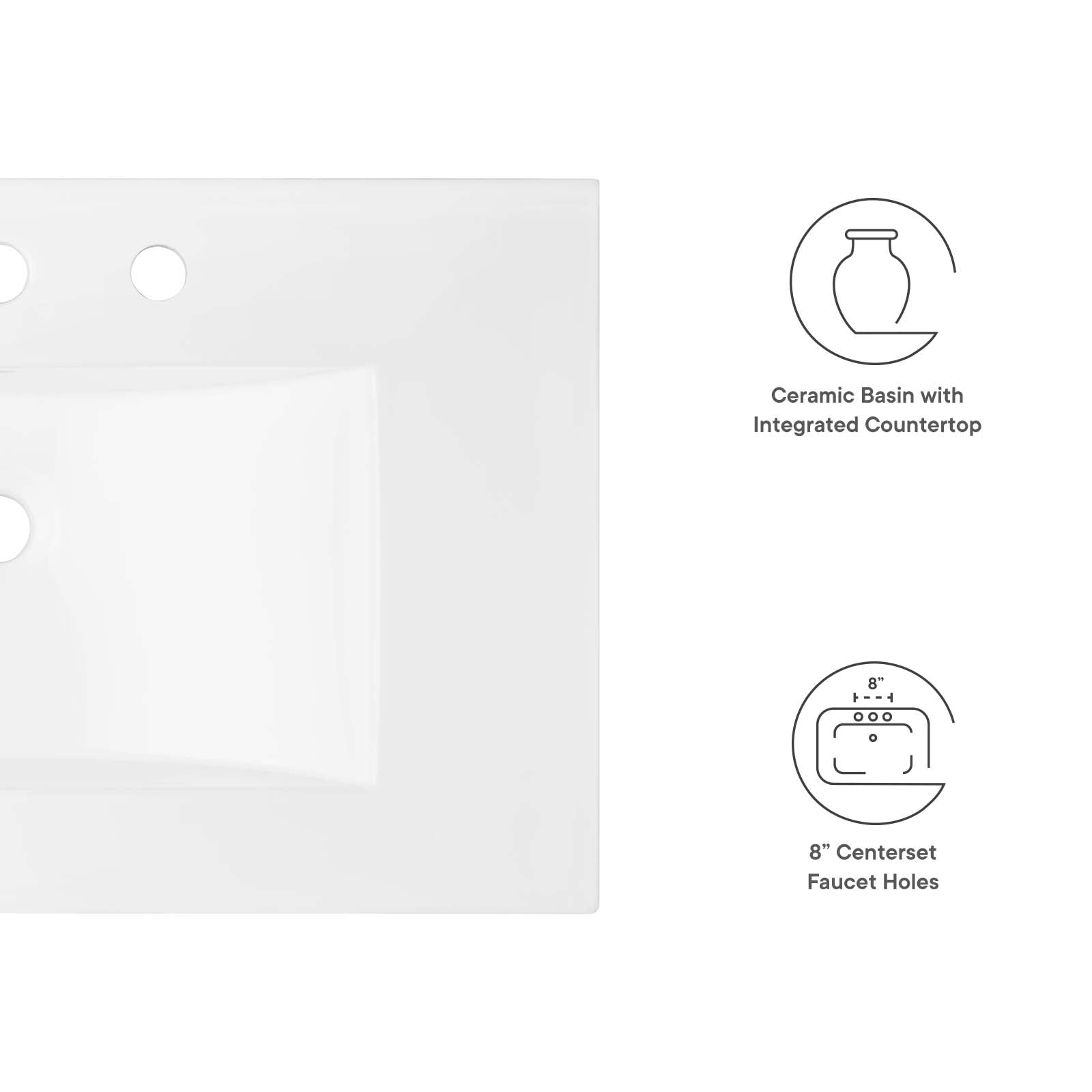 • Bullets: Modern 30" Bathroom Sink Ceramic Construction 8-Inch Centerset Faucet Holes Integrated Countertop Rectangular Basin