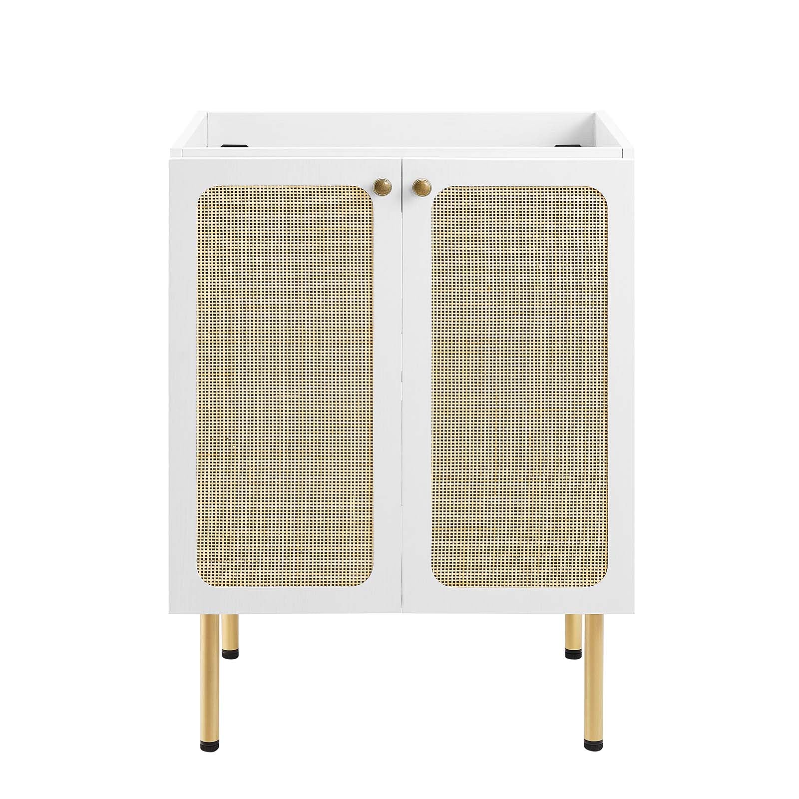Refresh your washroom with the textured detail of the Chaucer 24" Bathroom Vanity Cabinet. Featuring beautiful rattan weaving on its doors, this vanity cabinet instantly updates any bathroom or powder room. A spacious adjustable top shelf and a fixed bottom shelf hidden behind its hinged doors offers ample storage space for toiletries, towels, and other bathroom essentials. Enriched by stylish round metal cabinet knobs and resting on sleek legs with adjustable feet for added stability, this bathroom cabinet is durably crafted with MDF, particleboard, and wood grain laminate to bring natural organic aesthetics to your decor. Assembly required. Fixtures and sink basin not included. Top Shelf Weight Capacity: 33 lbs. Bottom Shelf Weight Capacity: 66 lbs. Set Includes: One - Chaucer 24" Bathroom Vanity Cabinet (Sink Basin Not Included)