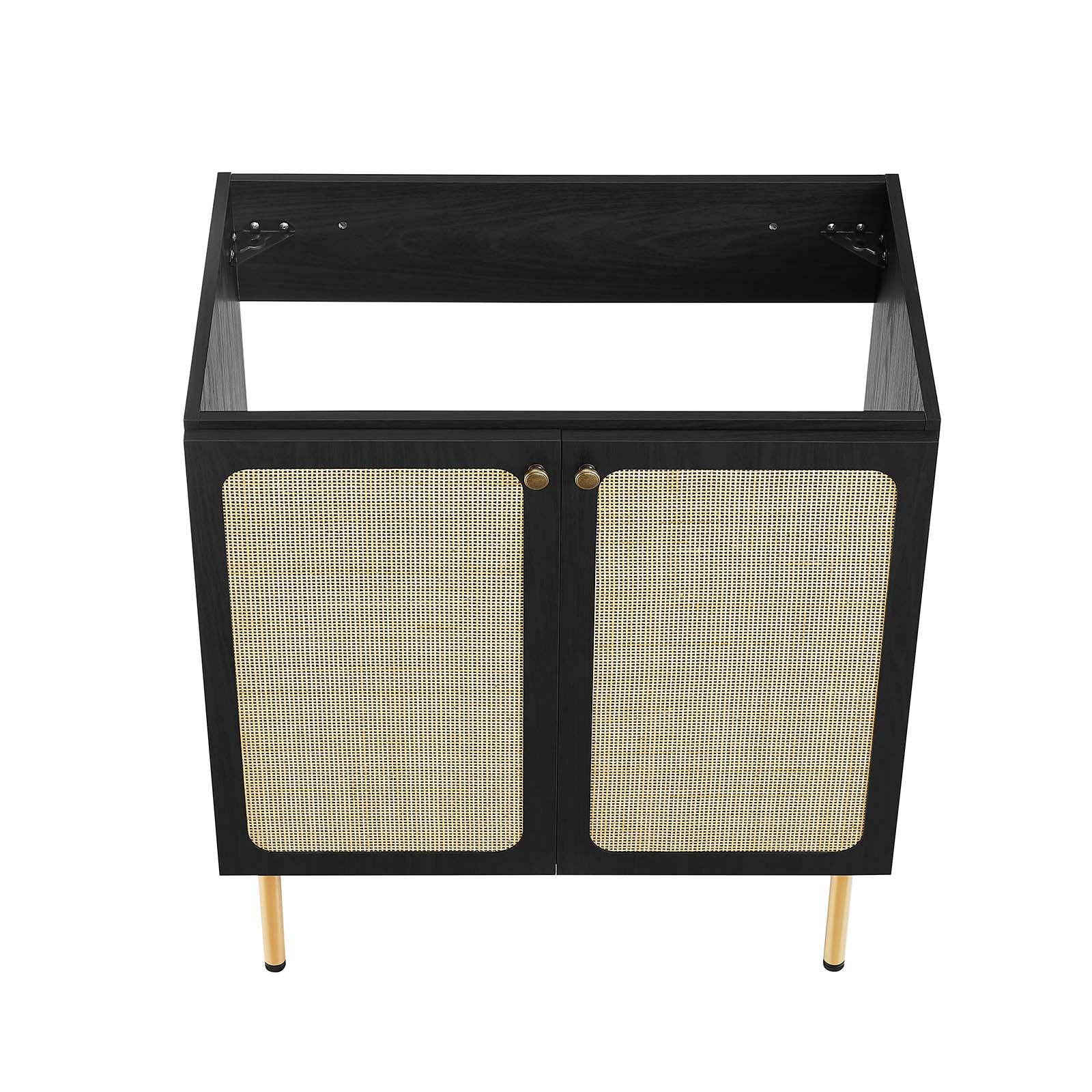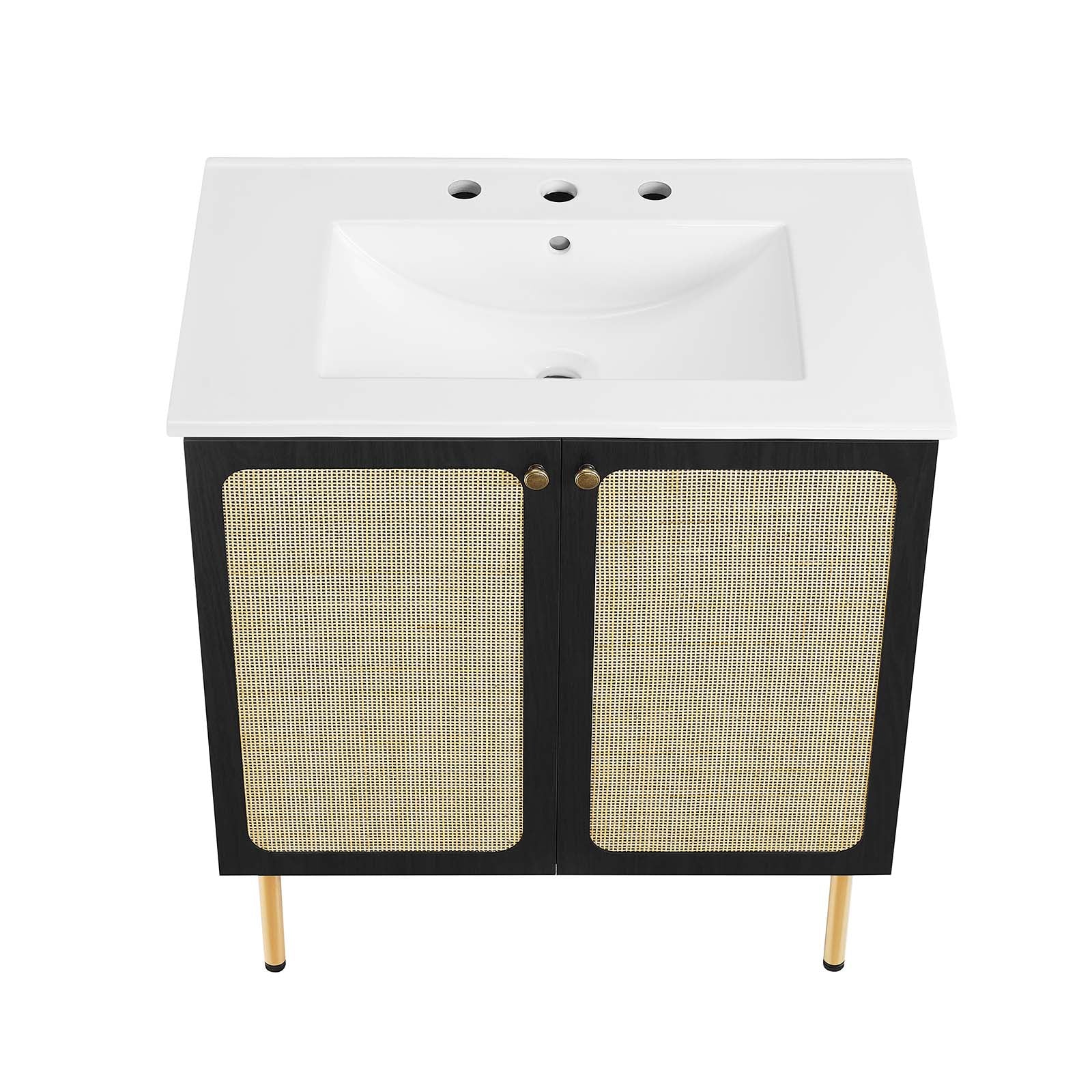 Refresh your washroom with the textured detail of the Chaucer 30" Bathroom Vanity. Featuring beautiful rattan weaving on its doors, this vanity cabinet instantly updates any bathroom or powder room. A spacious adjustable top shelf and a fixed bottom shelf hidden behind its hinged doors offers ample storage space for toiletries, towels, and other bathroom essentials. With a ceramic basin with 8" centerset holes and an integrated countertop, this vanityÕs design highlights its sleek countertop for an added touch of elegance. Enriched by stylish round metal cabinet knobs and resting on sleek legs with adjustable feet for added stability, this bathroom cabinet is durably crafted with MDF, particleboard, and wood grain laminate to bring natural organic aesthetics to your decor. Assembly required. Fixtures not included. Top Shelf Weight Capacity: 40 lbs. Bottom Shelf Weight Capacity: 81 lbs. Set Includes: One - Cayman 30" Bathroom Sink One - Chaucer 30" Bathroom Vanity Cabinet (Sink Basin Not Included)
