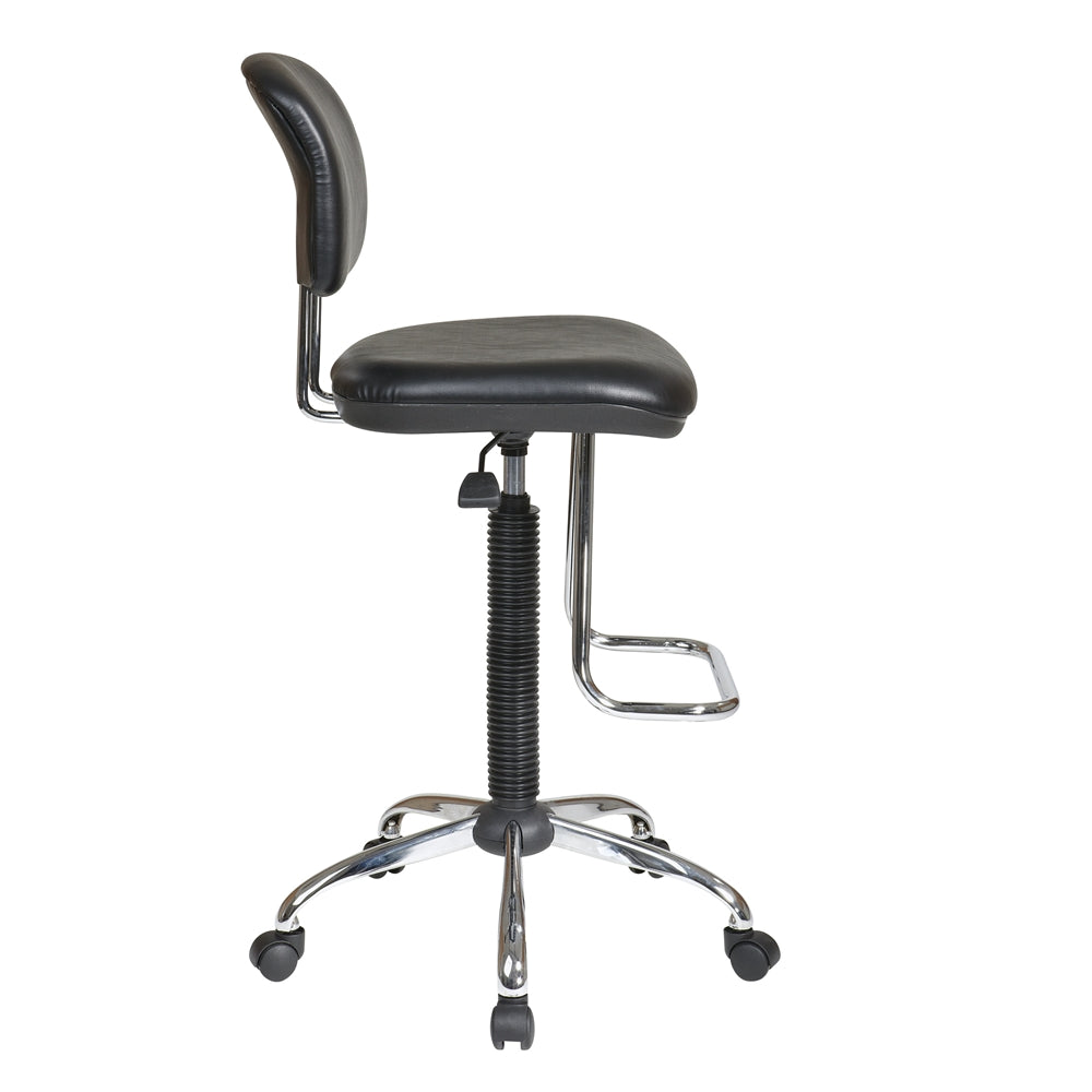 Chrome Finish Economical Chair with Teardrop Footrest. Pneumatic Drafting Chair with Vinyl Stool and Back. Height Adjustment 26" to 36" overall. Heavy Duty Chrome Base with Dual Wheel Carpet Casters
