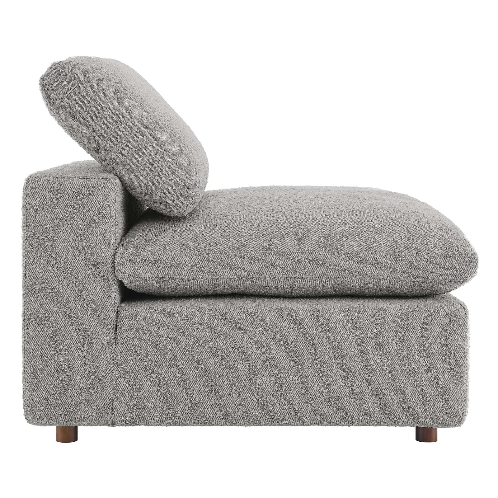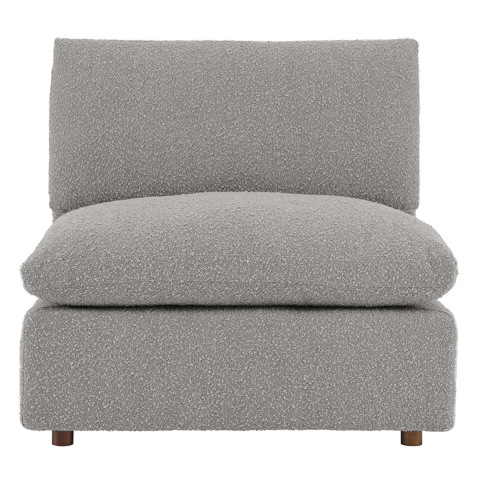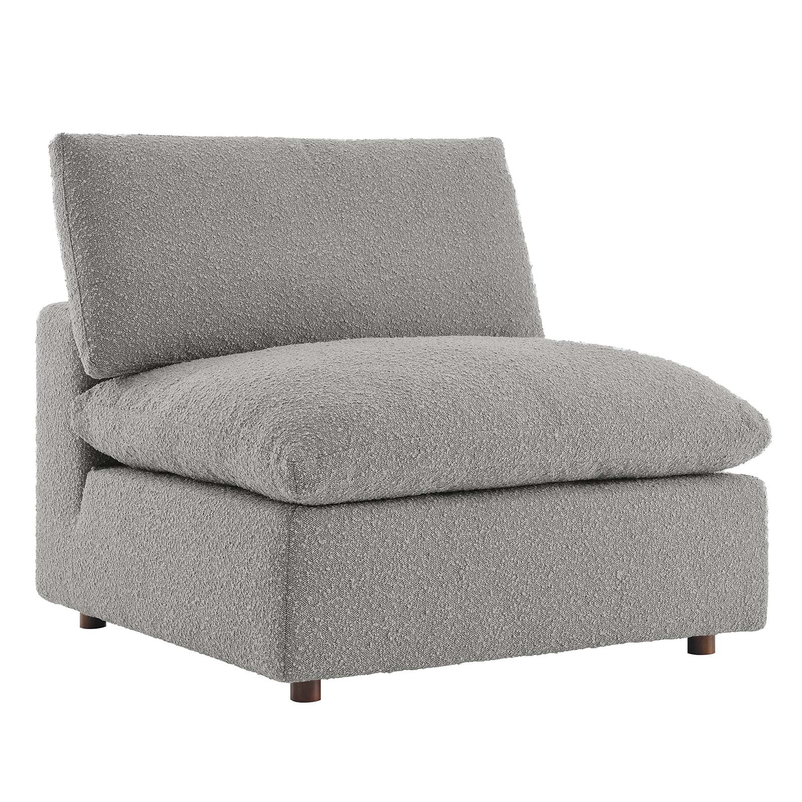 A haven for cozy relaxation, Commix features plush comfort and a clean-lined design. The spacious profile makes an attractive statement in the modern home. Covered in a boucle fabric with a charming nubby texture, this upholstered armless chair comes with a solid wood construction and foam padded and duck down cushions for a luxurious sink-in feel. Commix features overstuffed down feather cushions that offer a feeling of relaxation and calming comfort while lounging, making it the perfect addition to the living room, family room, or game room. Made for sprawling out or curling up, Commix beckons you and guests to sit and stay a while. Includes plastic foot glides. Armless Chair Weight Capacity: 331 lbs. Set Includes: One - Commix Armless