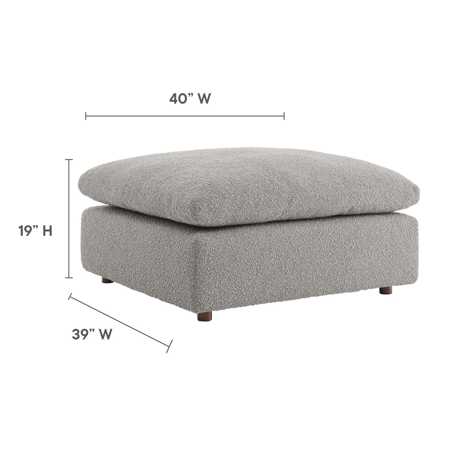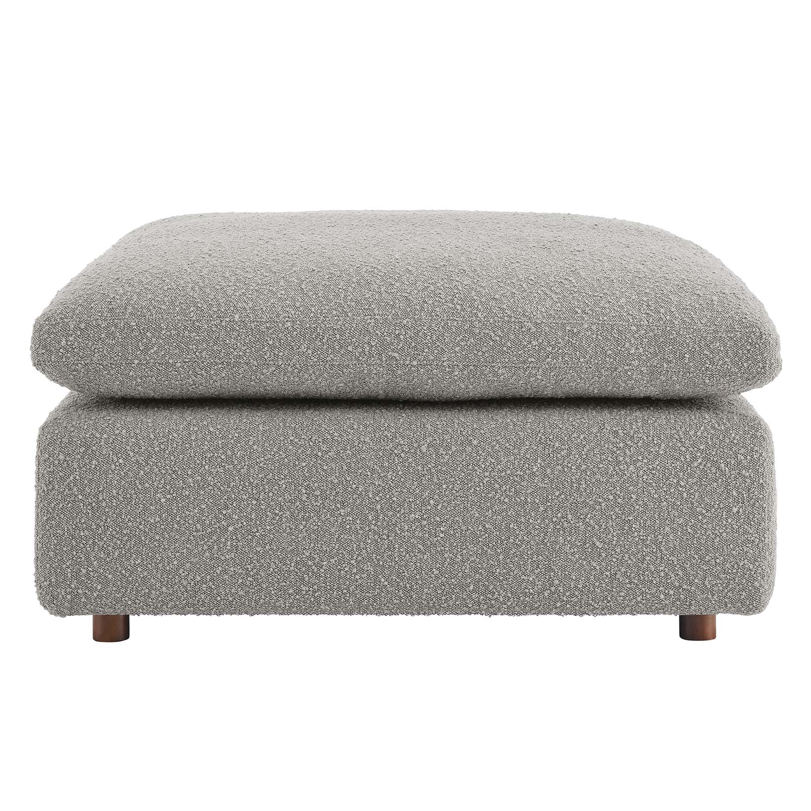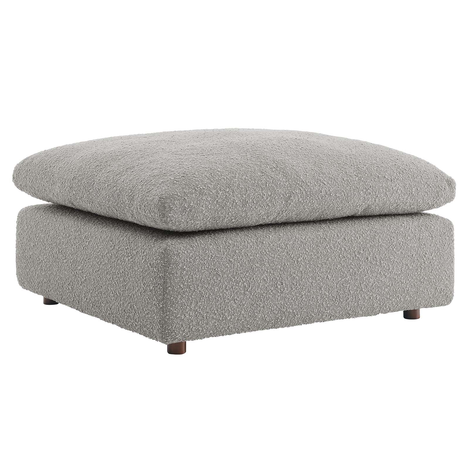 A haven for cozy relaxation, Commix features plush comfort and a clean-lined design. The spacious profile makes an attractive statement in the modern home. Covered in a boucle fabric with a charming nubby texture, this upholstered ottoman comes with a solid wood construction and foam padded and duck down cushions for a luxurious sink-in feel. Commix features overstuffed down feather cushions that offer a feeling of relaxation and calming comfort while lounging, making it the perfect addition to the living room, family room, or game room. Made for sprawling out or curling up, Commix beckons you and guests to sit and stay a while. Includes plastic foot glides. Ottoman Weight Capacity: 331 lbs. Set Includes: One - Commix Ottoman