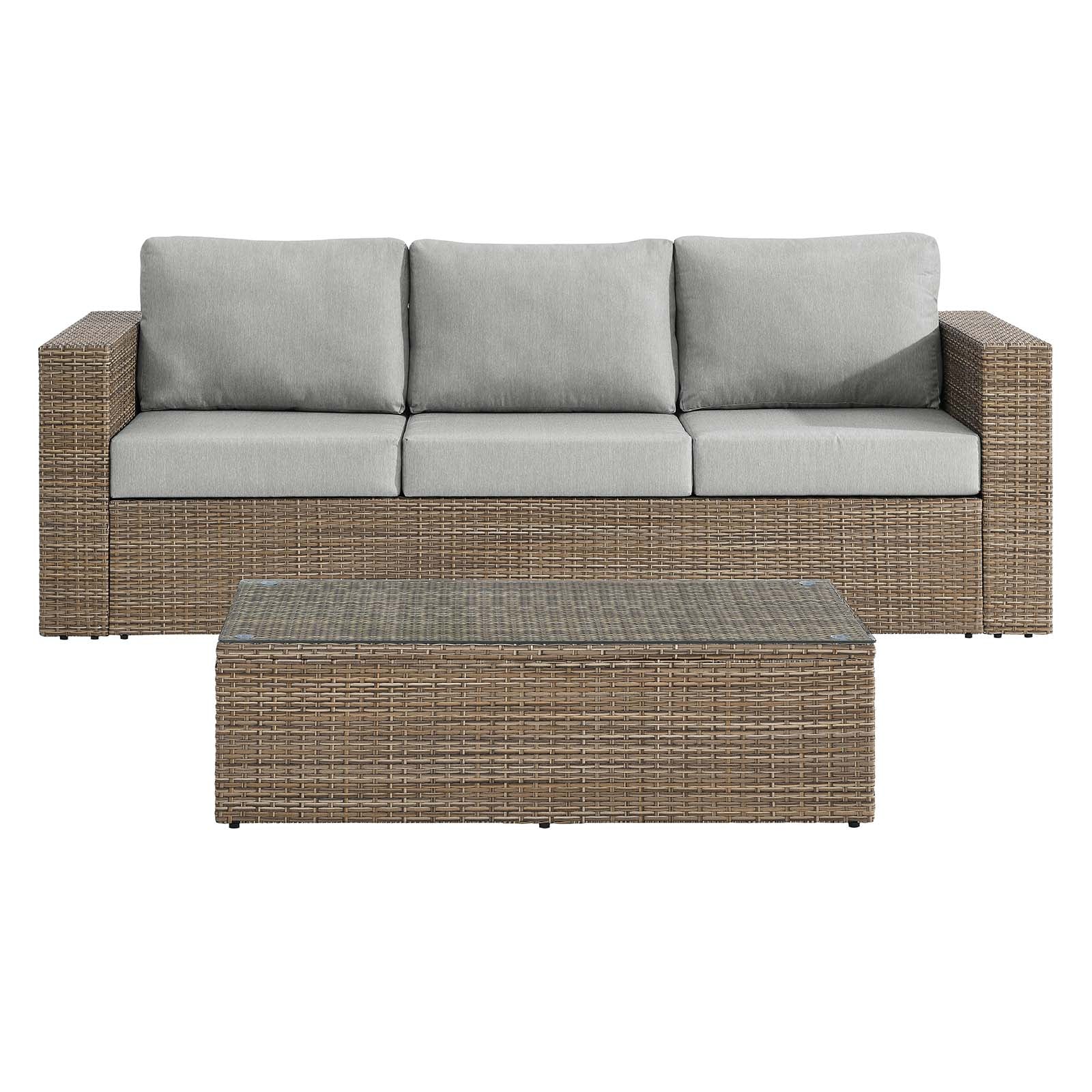 Surround yourself with warm weather and good company with the Convene Outdoor Collection. Made with synthetic rattan weave and powder-coated aluminum frames, this outdoor sofa and coffee table set leaves a positive impression on your guests while enhancing your patio, backyard, porch, or poolside with modern style and appreciated texture. A lasting all-weather addition to your outdoor space, this patio sofa is complete with dense foam padded cushions with water-resistant zippered covers and non-marking foot pads to protect your flooring. The outdoor coffee table features an easy-to-clean tempered glass top. Assembly required. Easy to follow instructions included. Set Includes: 1 Sofa, 1 Coffee Table Set Includes: One - Convene Outdoor Patio Coffee Table One - Convene Outdoor Patio Sofa