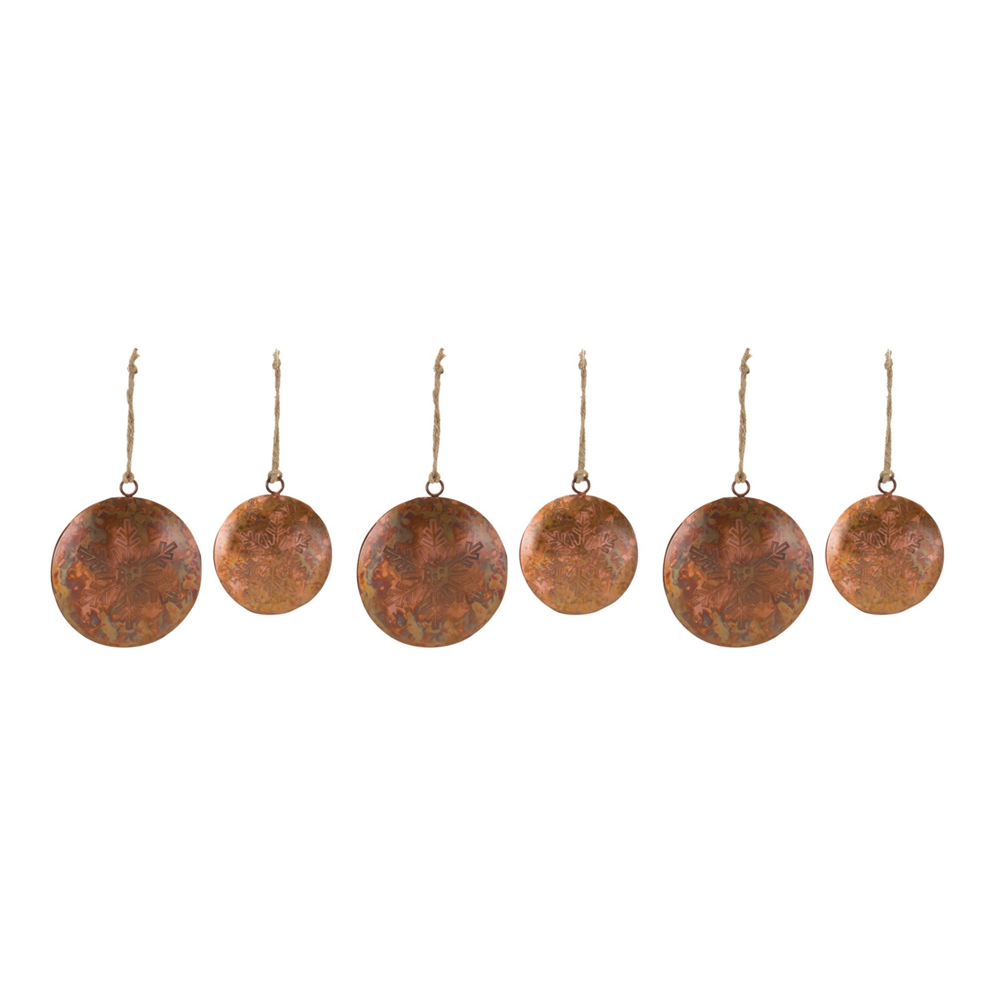 Adorn your Christmas tree and holiday decor with this stunning set of Distressed Metal Snowflake Disc Ornaments. Featuring 6 pieces, the rustic bronze tones paired with the distressed design is the perfect combination to create a memorable display. The quality iron composition and delicate jute hanging accent is sure to endure for seasons to come. Whether you're adding a touch of cheer to your home or gifting to a loved one, these ornaments will definitely bring smiles. , Disc Ornament (Set of 6) 3.75"H, 4.75"H Iron