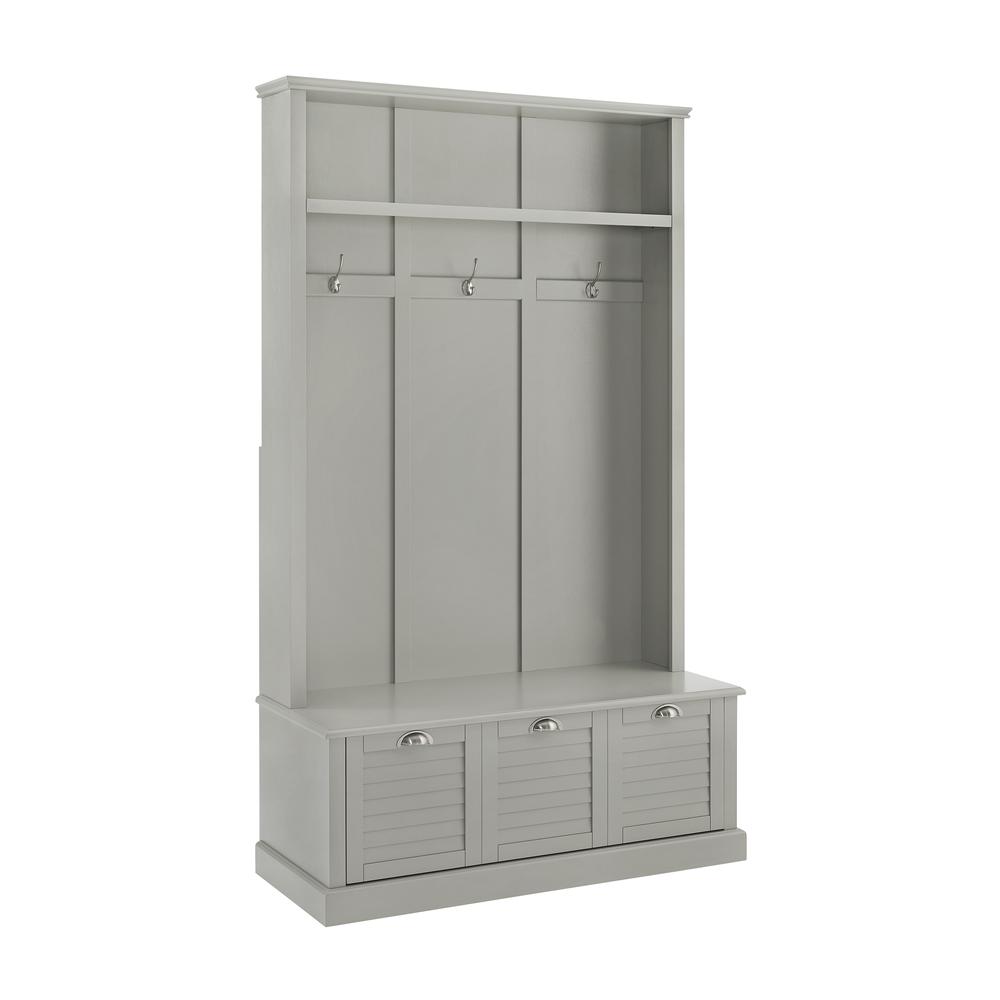 Keep your homeÕs entryway tidy and organized with the classic Ellison Hall Tree. Featuring louvered accents on the bottom drawer and raised paneling on the back, this hall tree makes any mudroom look good. Combining the convenience of a coat rack and shoe rack, this piece offers three double-pronged hooks and an entryway bench with a pull-out storage drawer. A display shelf at the top of the coat tree is perfect for smaller items like keys and sunglasses. Whether you're coming or going, the Ellison Hall Tree will keep all your everyday items close at hand.