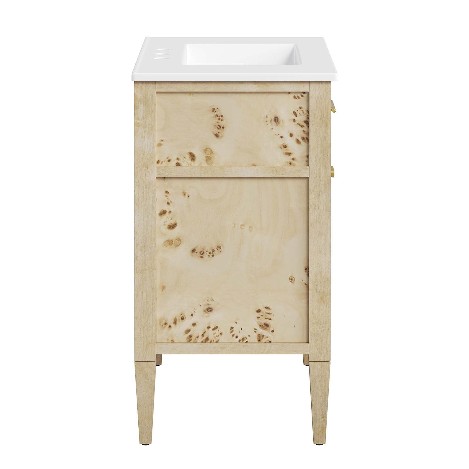 Discover the epitome of organic aesthetics and practicality with the Elysian 30" Burl Wood Bathroom Vanity. Each vanity cabinet is uniquely crafted from exquisite mango wood, further adorned with a rich burl wood veneer, radiating a distinctive charm and character. This bathroom vanity's centerpiece is an elegant ceramic sink basin, thoughtfully designed with an integrated countertop and 8" centerset holes ready for your choice of fixtures (not included). A fixed top drawer and tapered wood legs add to the sleek design, while the spacious shelving beneathÐcomplete with a convenient plumbing cutoutÐoffers ample storage space for all your bathroom essentials. While assembly is required, this vanity includes easy-to-follow assembly instructions. Set Includes: One - Cayman 30" Bathroom Sink One - Elysian 30" Bathroom Vanity Cabinet
