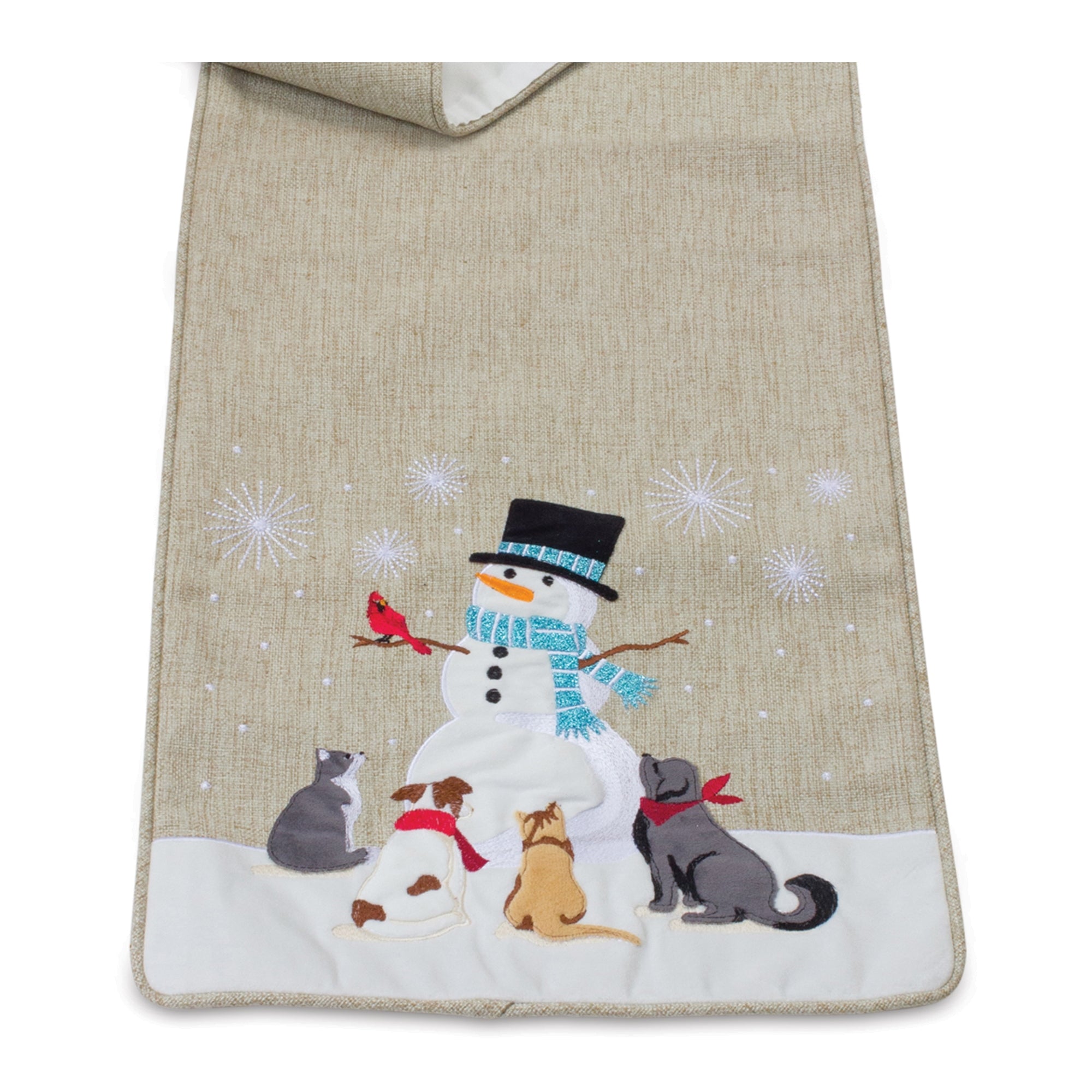 Add a festive touch to your holiday table with this exquisite Holiday Table Runner! Our wintry white and beige tones and whimsical embroidered snowman with dog, cat, and bird accents will give your home a classic, festive atmosphere. Made from quality polyester fabric, this table runner is durable and easy to care for. Create special memories with loved ones this season with the perfect dining table accent!, Snowman w/Cardinal Runner 70"L x 15"W Polyester