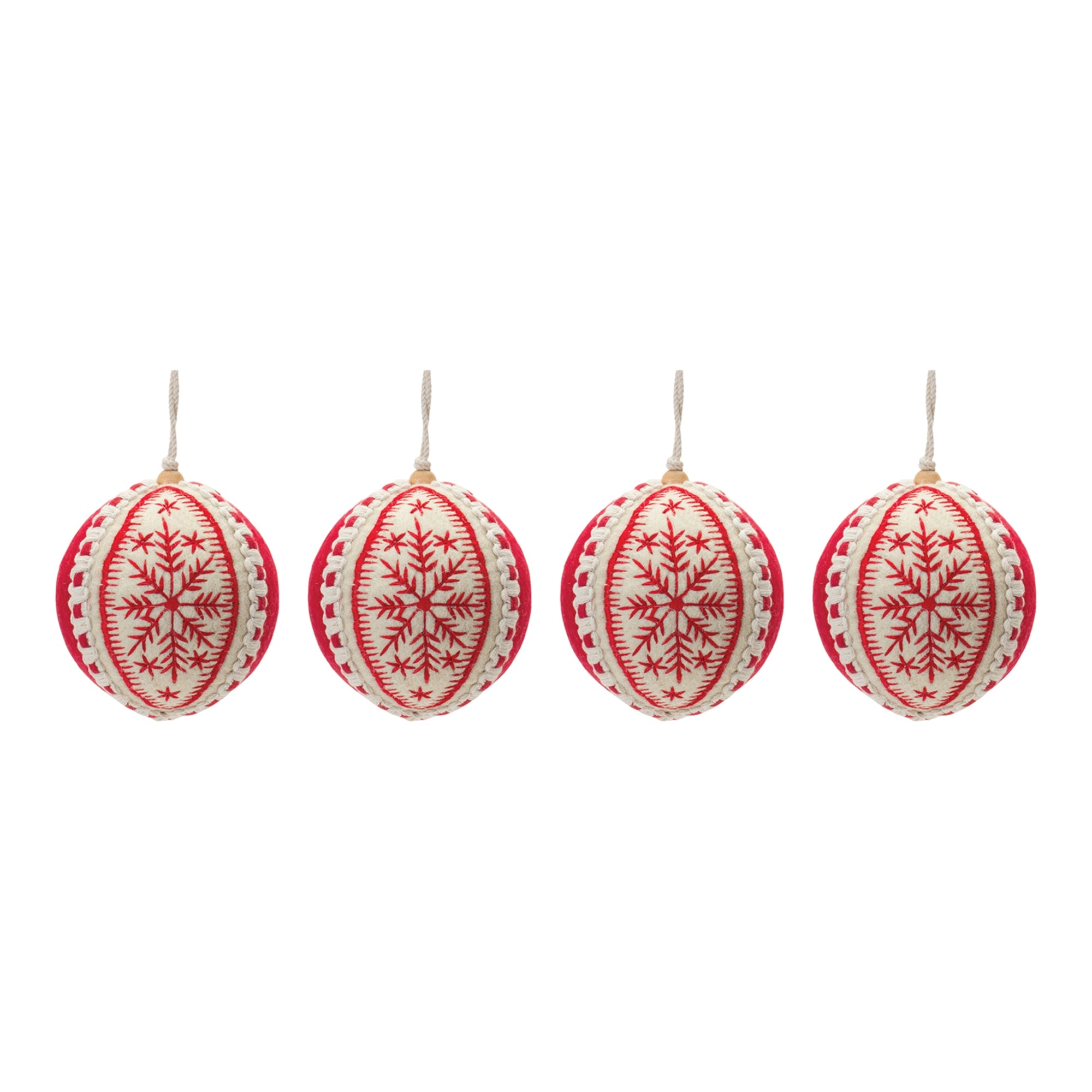 Adorn your Christmas tree and holiday decor with this stunning set of Embroidered Wool Heart Ornaments. Featuring 6 pieces, the festive red and wintry white tones paired with the embroidered design is the perfect combination to create a memorable display. The quality plastic and wool composition and delicate string hanging accent is sure to endure for seasons to come. Whether you're adding a touch of cheer to your home or gifting to a loved one, these ornaments will definitely bring smiles. , Ball Ornament (Set of 4) 4"D Wool