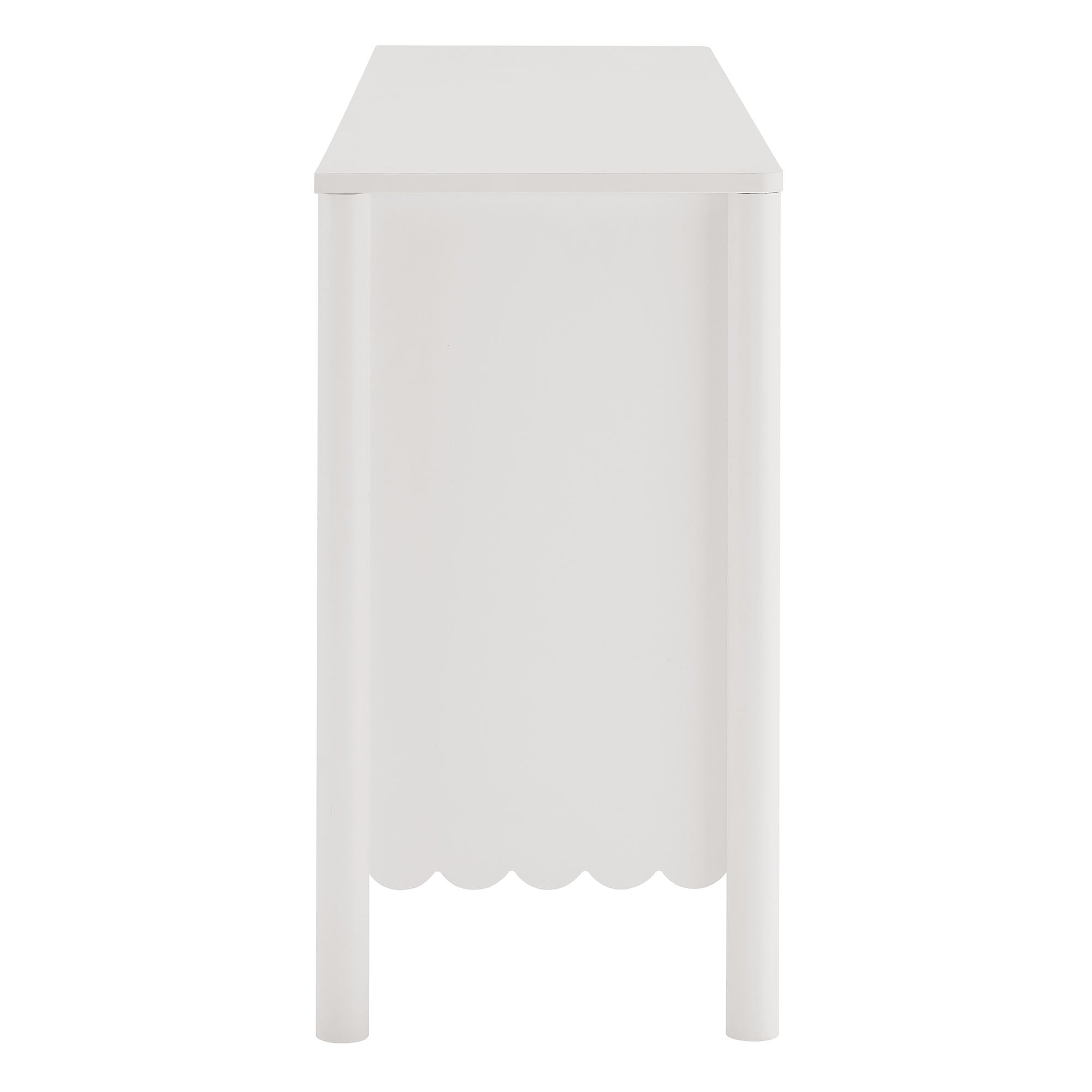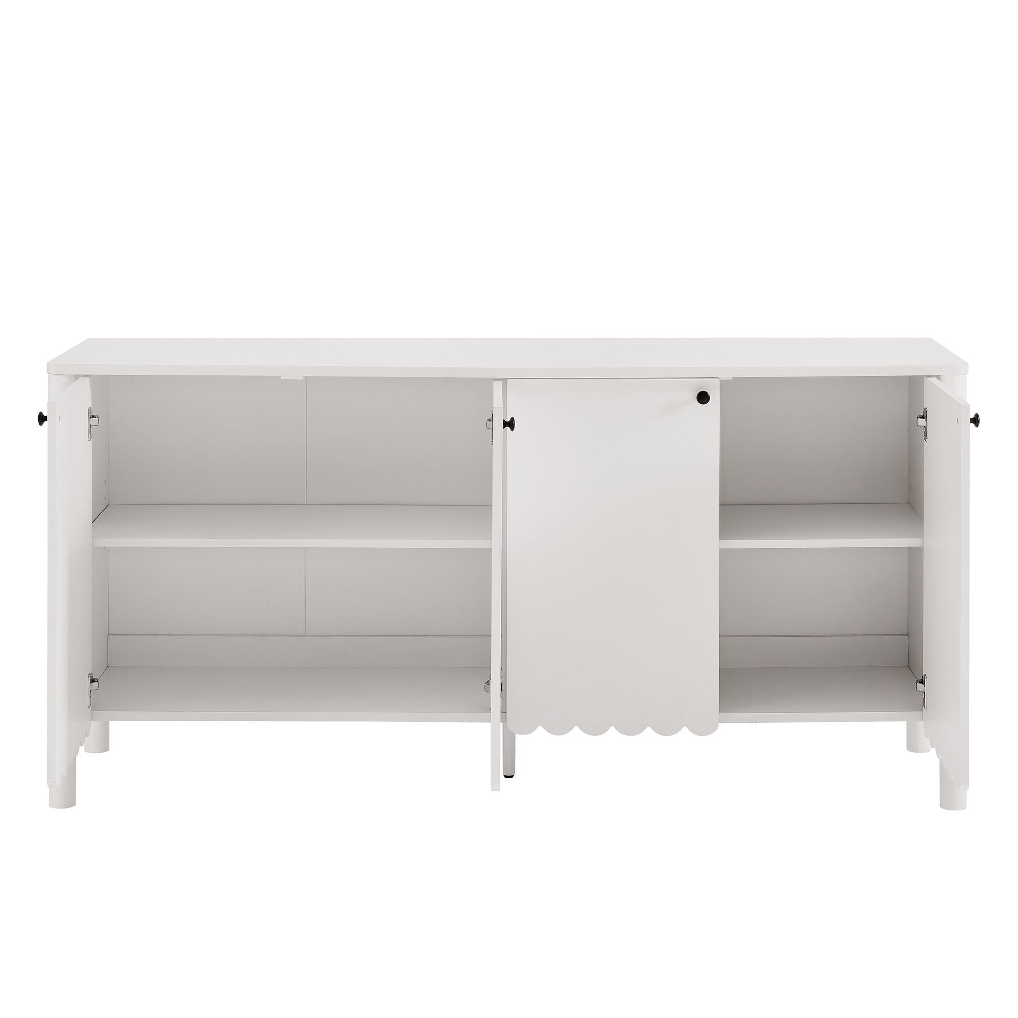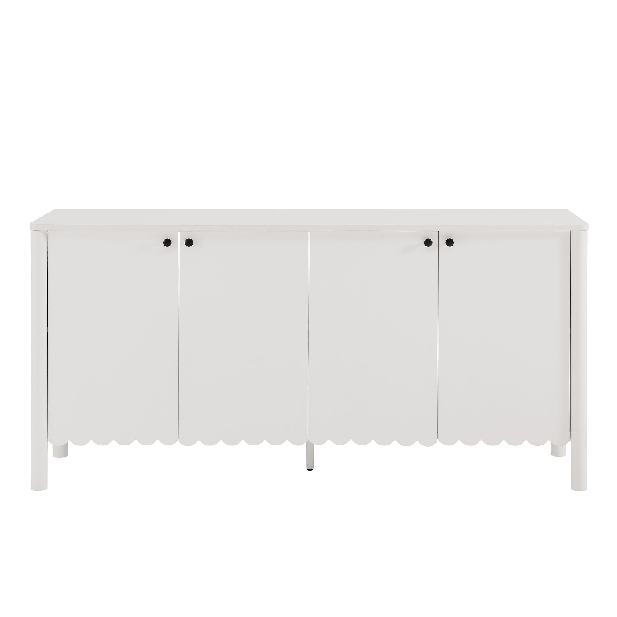 An elegant blend of subtle curves and practical storage, the Emmeline 4-Door Wavy Sideboard Cabinet adds a touch of artistic flair to any room. Its standout featureÑa scalloped bottom edgeÑcreates a soft, flowing silhouette that enhances the modern simplicity of the design. Behind its four soft-close doors, adjustable shelves provide flexible storage space, ideal for organizing dining essentials, decor, or media accessories. Crafted with a sturdy frame and finished in smooth laminate, this wide farmhouse sideboard is as functional as it is stylish. The round door knobs and non-marking glides add to its refined appearance, while ensuring your floors remain protected. Whether serving as a modern sideboard, accent cabinet, or entryway console with storage, Emmeline brings a contemporary, polished look to hallways, dining rooms, or living spaces. Assembly required. One - Emmeline 66" 4-Door Sideboard Cabinet