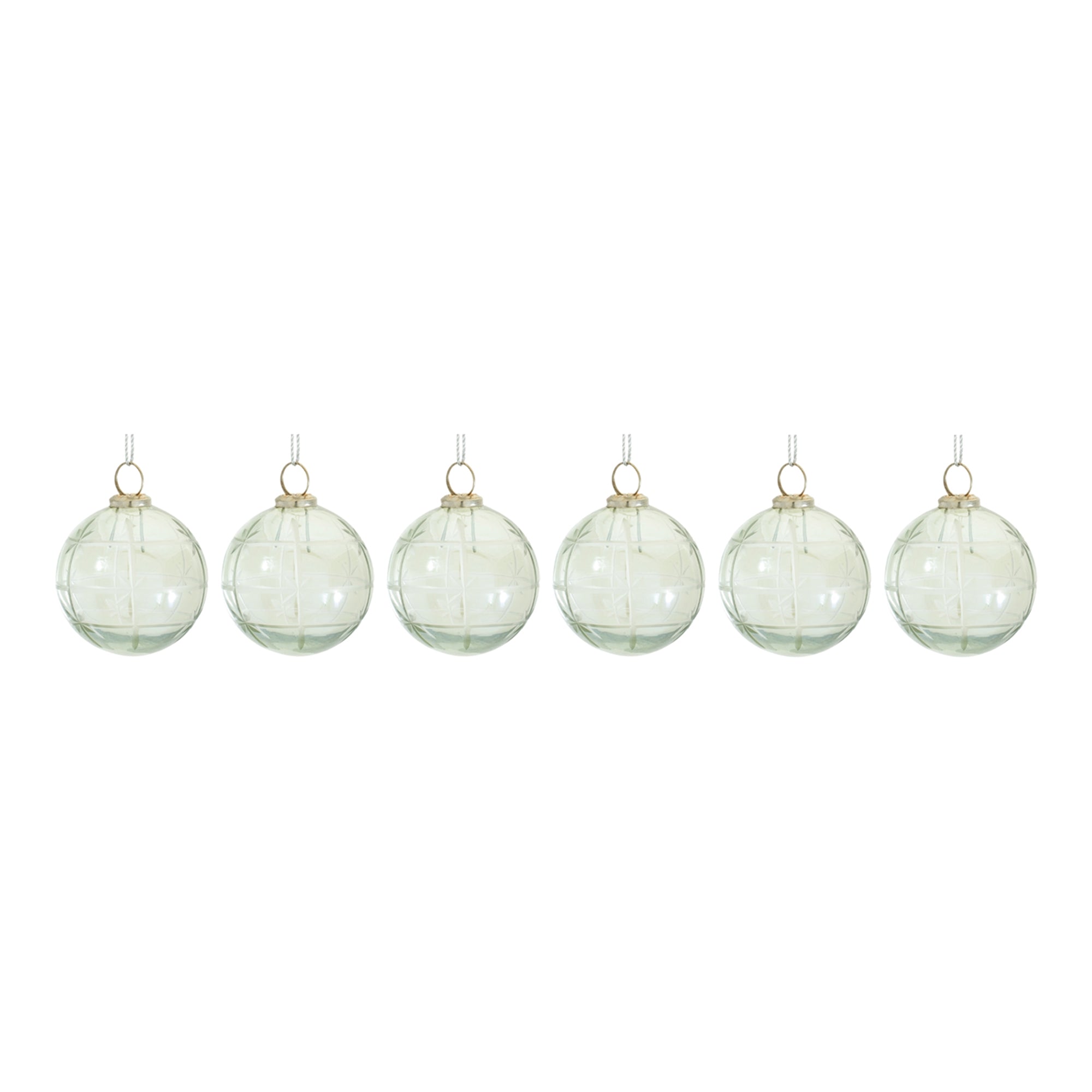 Adorn your Christmas tree and holiday decor with this stunning set of Etched Glass Ball Ornaments. Featuring 6 pieces, the wintry white and versitile clear tones paired with the etched design is the perfect combination to create a memorable display. The quality glass composition and delicate silver string hanging accent is sure to endure for seasons to come. Whether you're adding a touch of cheer to your home or gifting to a loved one, these ornaments will definitely bring smiles. , Ball Ornament (Set of 6) 3"D Glass