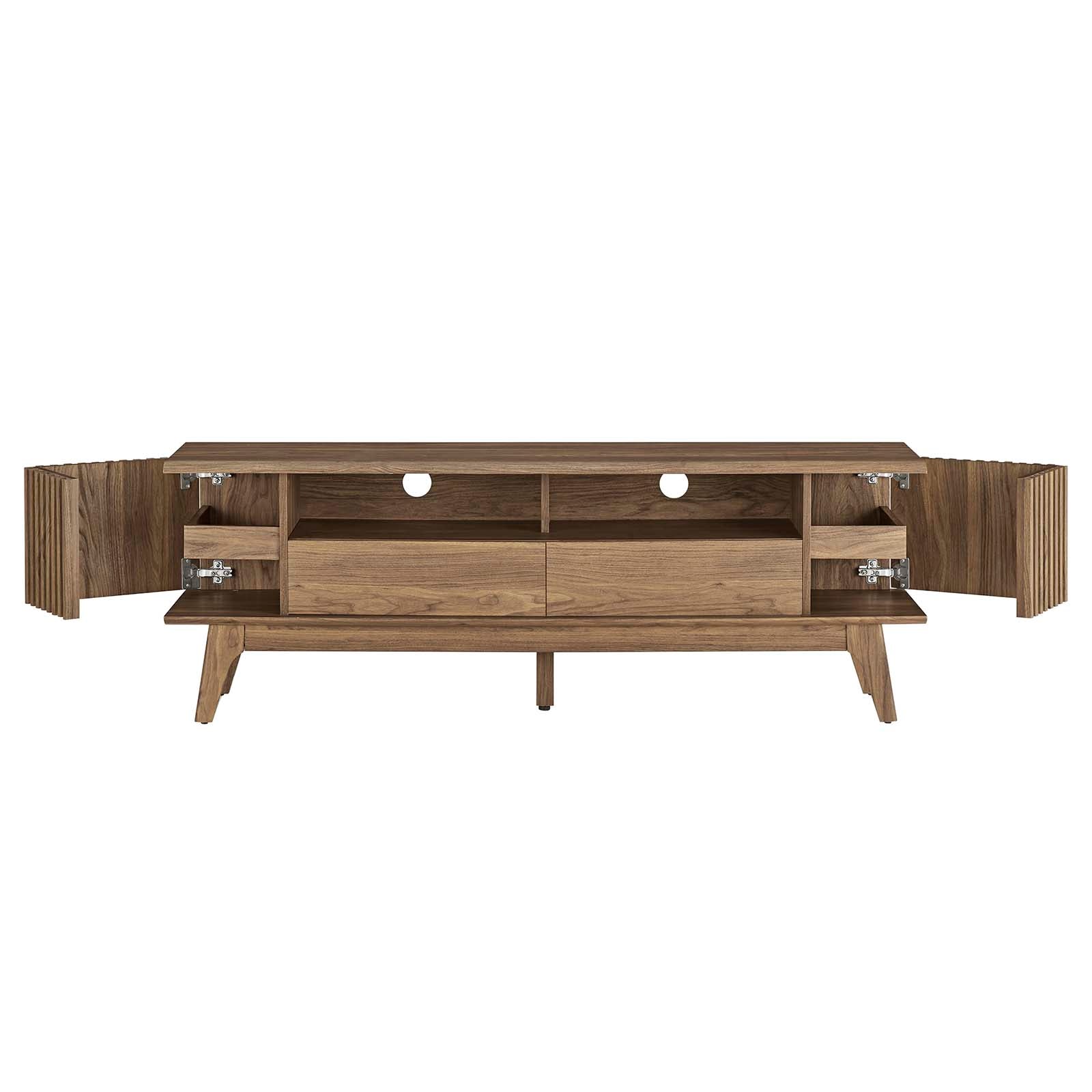 Transform your living space with the Eudora TV Stand. Constructed with MDF and particleboard with a beautiful wood grain design, this entertainment console is both stylish and durable. The perfect addition to a living room, family room, or lounge area, this versatile piece serves its purpose as a modern TV stand with ample storage for media essentials and cable management holes. Vertical slatting on the hinged doors grants elegant definition to its overall look. With open and concealed shelving areas and full-glide drawers, this media center is designed for both storage and display. Bringing mid-century inspiration to the home, its splayed base and non-marking foot pads ensure stability and protect your floors from scratches. Assembly is required, but our easy-to-follow instructions make it a breeze. Weight Capacity: 200 lbs. Set Includes: One - Eudora 60" TV Stand
