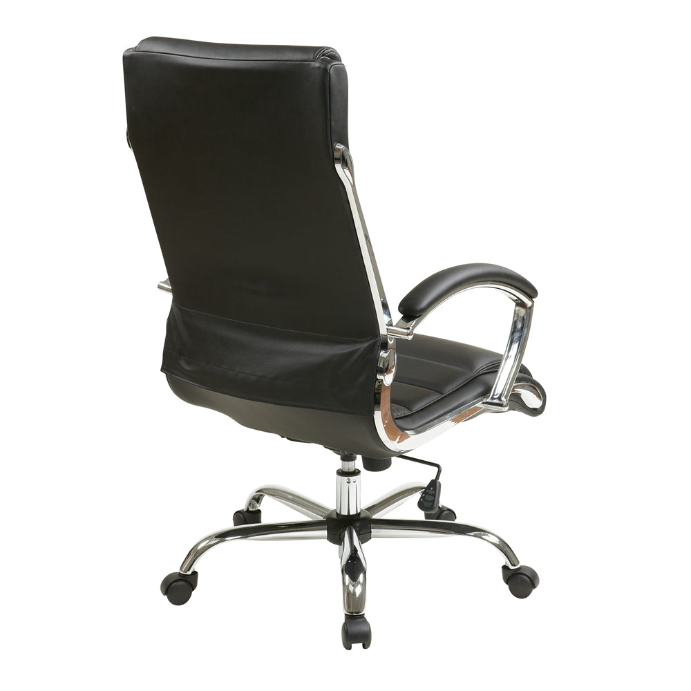 Executive Chair with thick padded Black faux leather seat and back with built-in lumbar support. Features include pneumatic seat height adjustment, locking tilt control with adjustable tilt tension, padded arms with chrome finish accents and heavy duty chrome finish base with dual wheel carpet casters