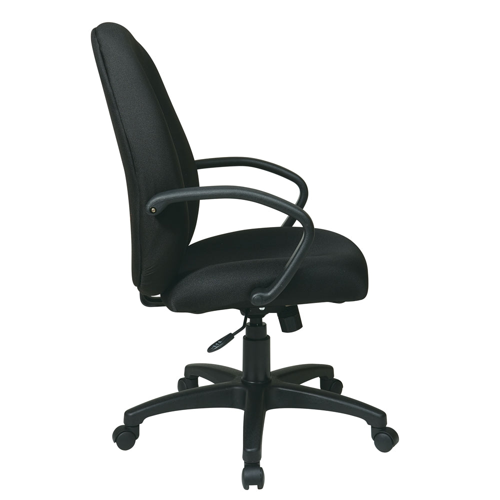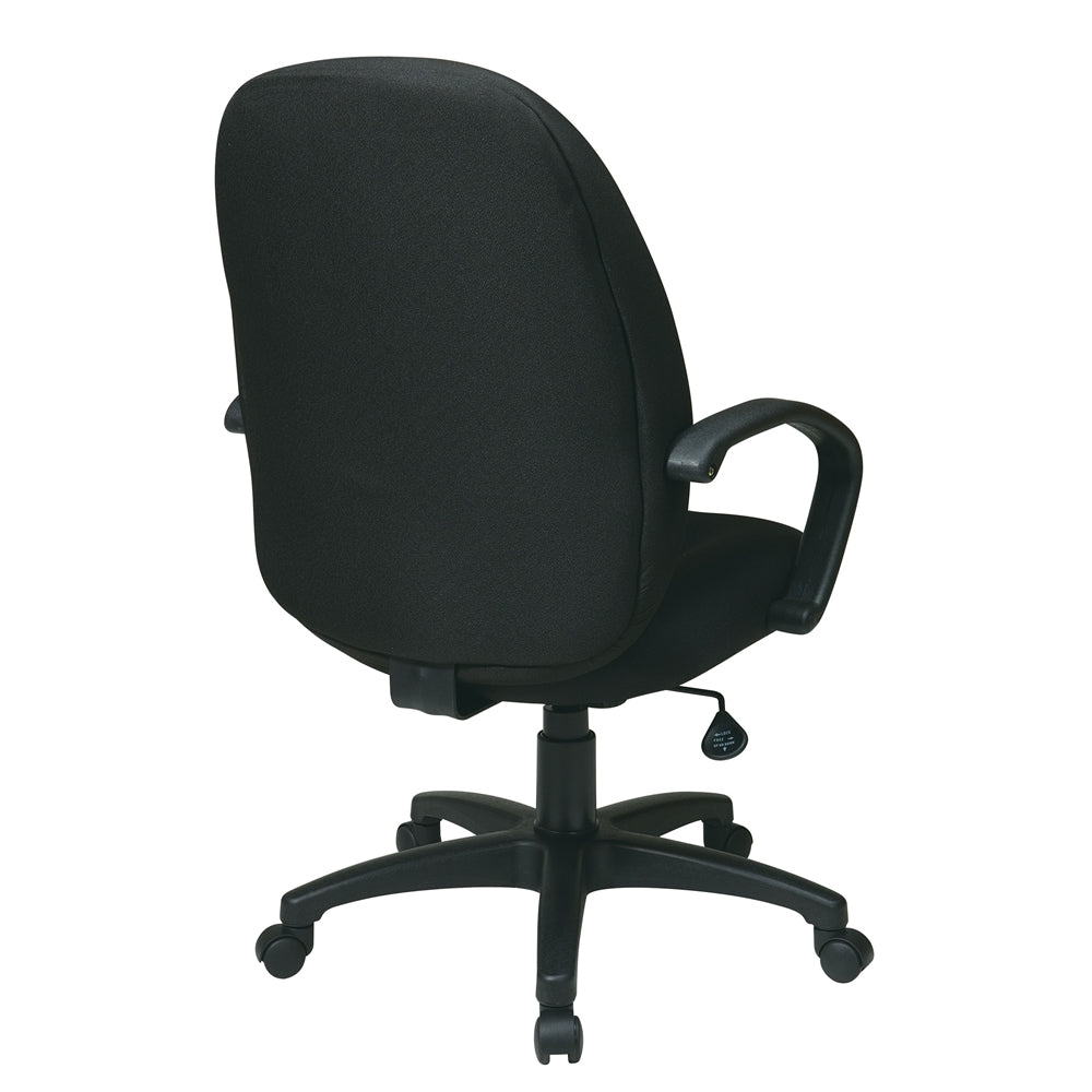 Executive High Back Managers Chair with Fabric Back. Thick Padded Contour Seat and Back with Built-in Lumbar Support. One Touch Pneumatic Seat Height Adjustment. Locking Tilt Control with Adjustable Tilt Tension. Nylon "C" Arms. Heavy Duty Nylon Base with Dual Wheel Carpet Casters.