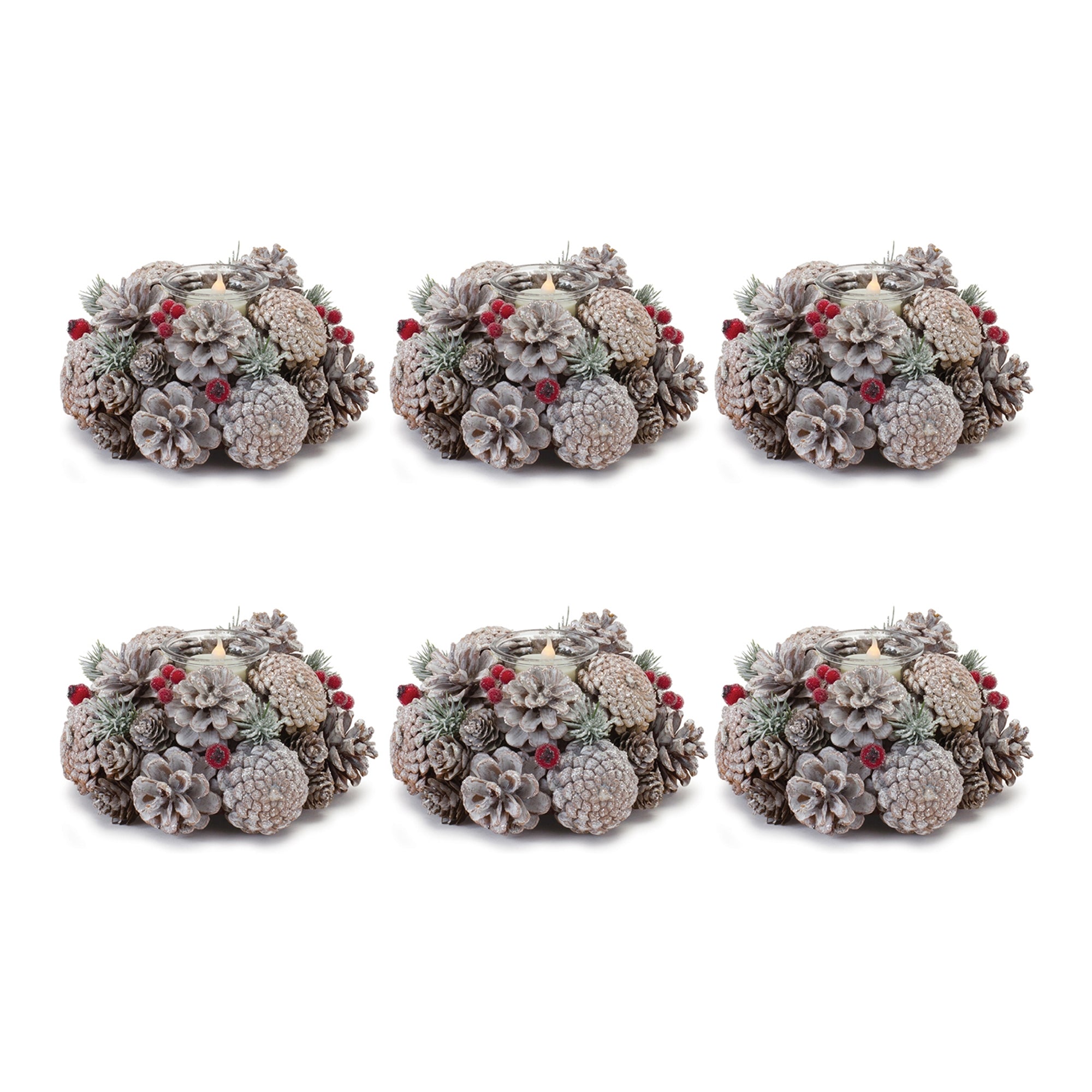 Add a natural touch to your home for the holiday season with this beautiful set of Pine Cone Votive Candle Holders. Featuring three pieces, this set is sure to fit in with your rustic or traditional style of Christmas dŽcor. The natural pine cone composition paired with the frosted finish and red berry accents is the perfect combination to create a memorable display. Illuminate the set by adding a real wax or LED candle to each glass holder. Candles sold separately, the set best fits a 1-2" votive candle., Pine Cone Votive Holder (Set of 6) 4"H Foam/Cone/Glass
