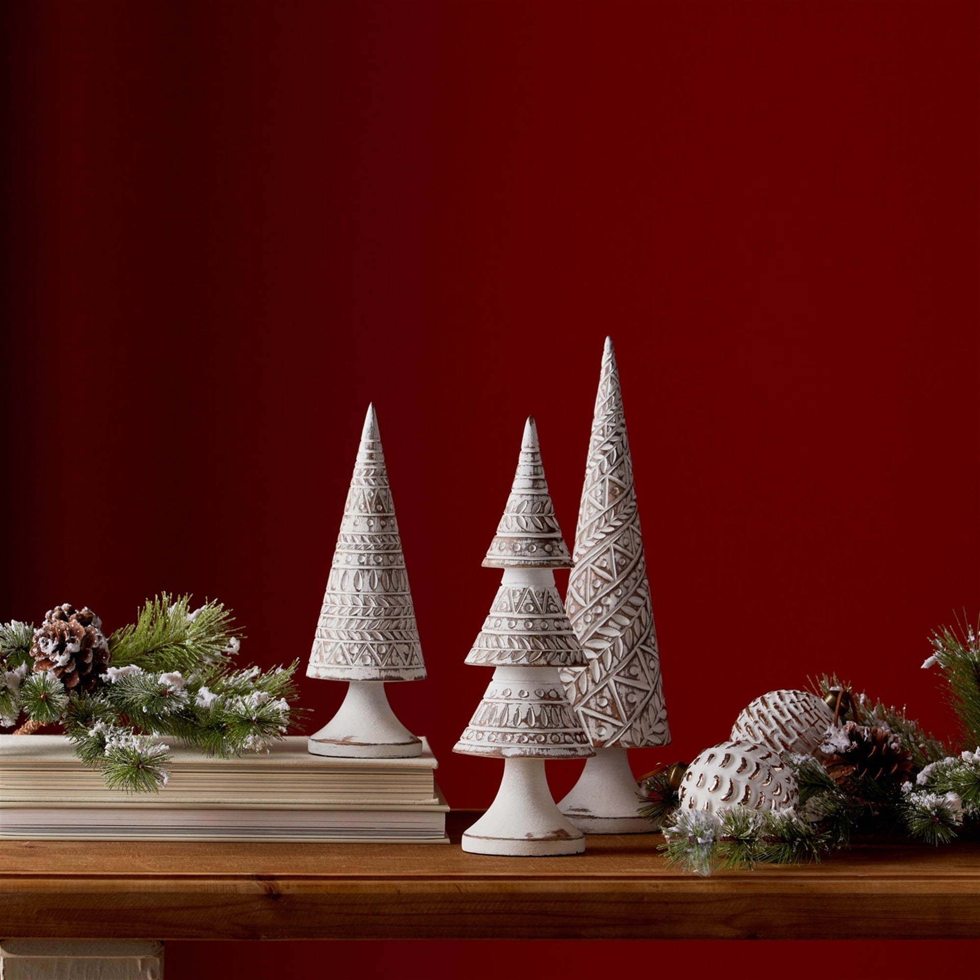 Enhance your holiday home decor with this stunning set of Holiday Tree decor. Featuring three assorted sizes, the geometric patterned wood designs paired with the white-washed finish makes this set a great addition to any style of Christmas decor. The quality polyresin and metal composition is sure to last for seasons to come. Display the pieces together to make a statement, or display along with other decor to spread the holiday cheer., Tree (Set of 3) 9.25"H, 11"H, 13.25"H Resin