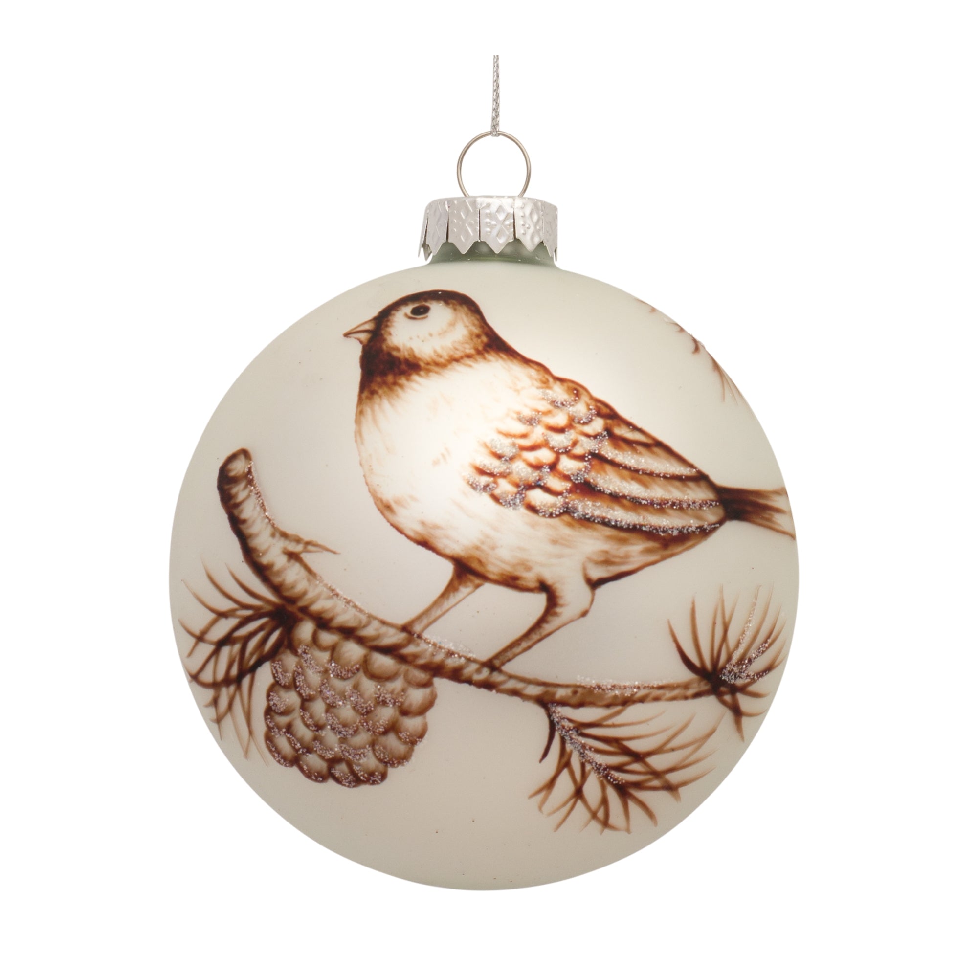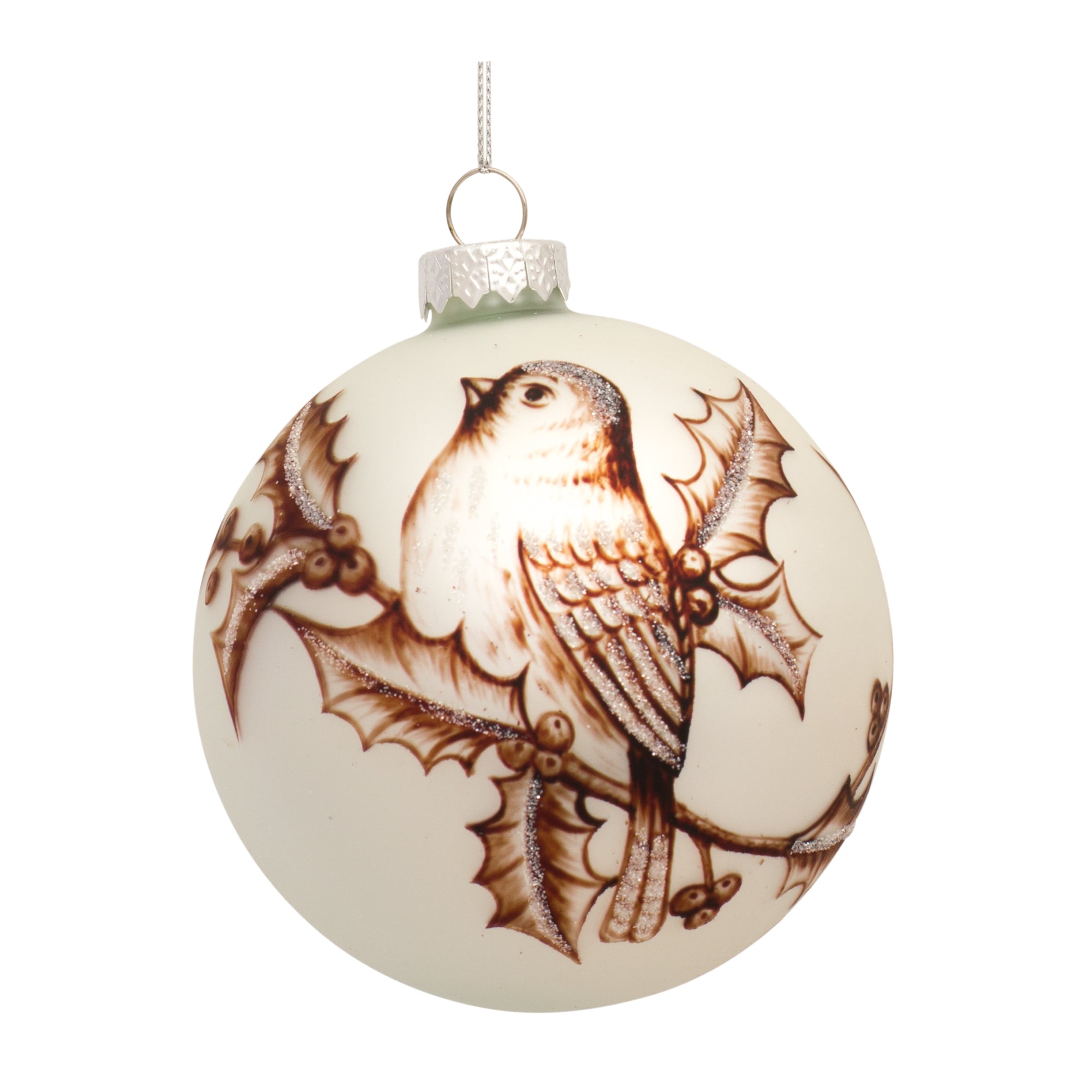 Adorn your Christmas Tree with this beautiful set of Bird Ball Ornaments. Featuring two assorted designs, the traditional ball ornament design paired with the delicate painted bird, pine, and holly artwork makes this set the perfect addition to your holiday tree decor. The pieces can be used as gifts for friends to cherish, or you can display the set on your own Christmas tree and enjoy them for years to come., Bird Ball Ornament (Set of 6) 4"D Glass
