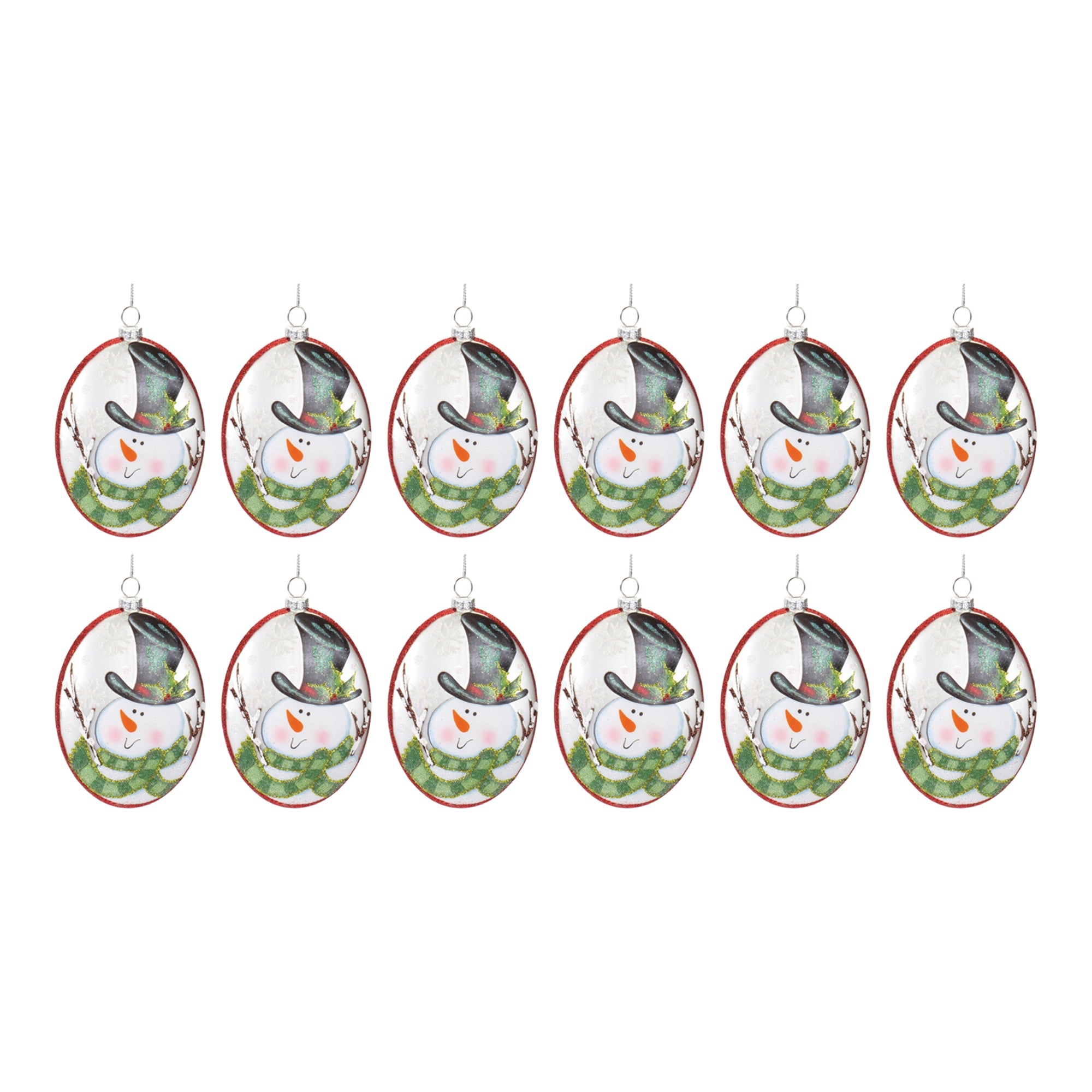 Add a whimsical touch to your Christmas Tree with this beautiful set of Glass Snowman Disc Ornaments. Featuring 12 pieces, this set's festive red and green tones, whimsical painted snowman design, and glittered scarf and snowflake accents are the perfect combination to create a memorable display. The quality glass composition with delicate silver string hanger is sure to endure for seasons to come. Whether you're adding a touch of cheer to your home or gifting to a loved one, these ornaments will definitely bring smiles to your home. , Snowman Disc Ornament (Set of 12) 5"H Glass