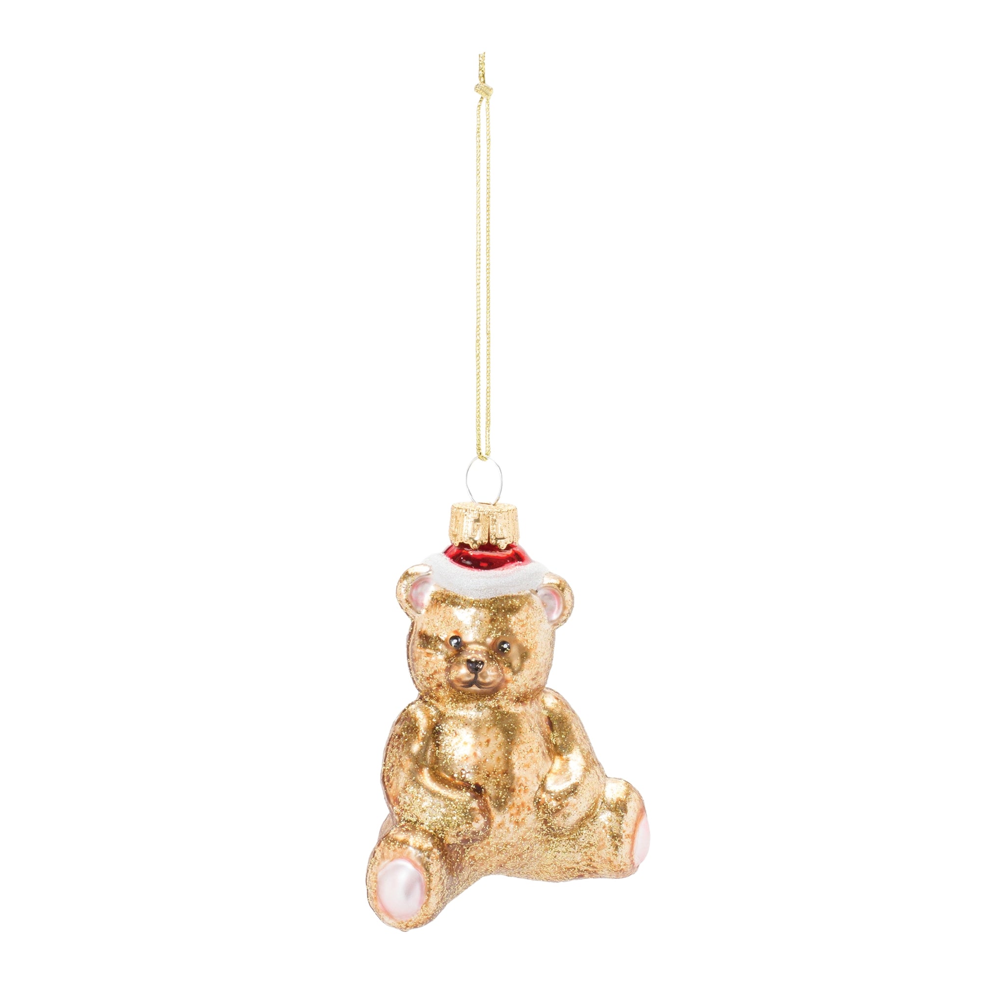 Add a whimsical touch to your Christmas Tree with this beautiful set of Glass Teddy Bear Ornaments. Featuring 12 pieces, this set's chic gold tones, whimsical teddy bear design, and glittered finish with cozy Santa hat accents are the perfect combination to create a memorable display. The quality glass composition with delicate gold string hanger is sure to endure for seasons to come. Whether you're adding a touch of cheer to your home or gifting to a loved one, these ornaments will definitely bring smiles to your home. , Teddy Bear Ornament (Set of 12) 3.75"H Glass
