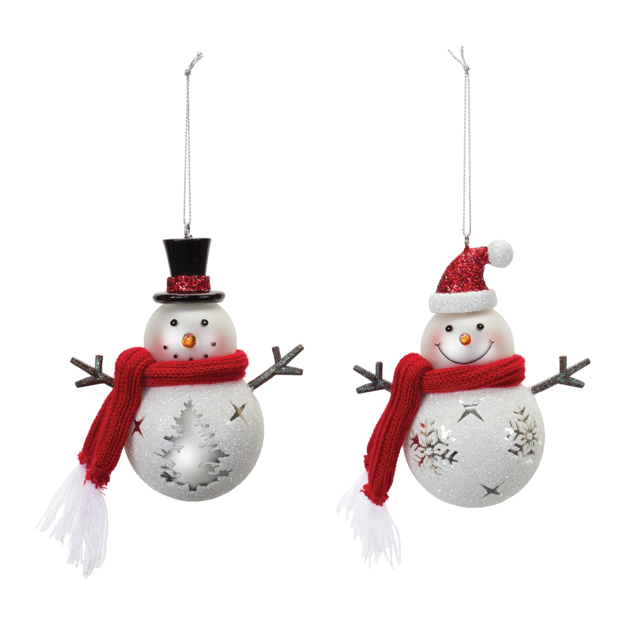 Add a whimsical touch to your Christmas Tree with this beautiful set of Glittered Glass Snowman Ornaments. Featuring 6 pieces, this set's festive red and white tones, whimsical snowman design, and glittered top hat and plush scarf accents are the perfect combination to create a memorable display. The quality glass composition with delicate silver string hanger is sure to endure for seasons to come. Whether you're adding a touch of cheer to your home or gifting to a loved one, these ornaments will definitely bring smiles to your home. , Snowman Ornament (Set of 6) 5"H Glass