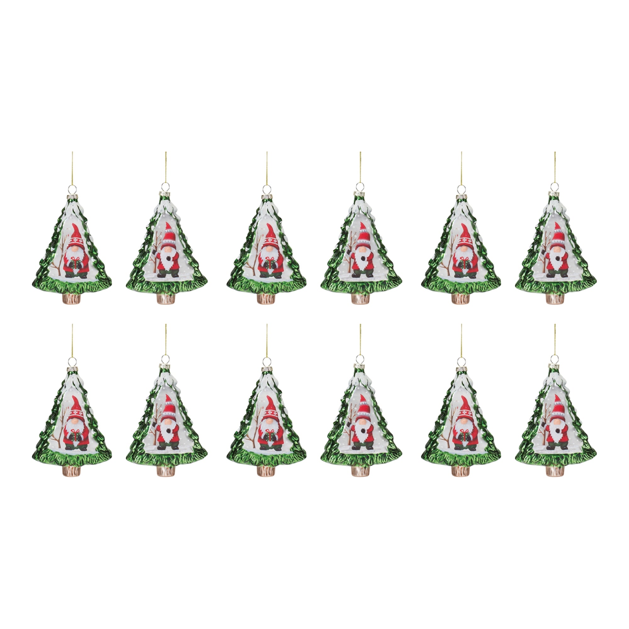 Add a whimsical touch to your Christmas Tree with this beautiful set of Glass Gnome Pine Tree Ornaments. Featuring 12 pieces, this set's festive red and green tones, whimsical painted gnome design, and snowy frosted accents are the perfect combination to create a memorable display. The quality glass composition with delicate gold string hanger is sure to endure for seasons to come. Whether you're adding a touch of cheer to your home or gifting to a loved one, these ornaments will definitely bring smiles to your home. , Gnome in Tree Ornament (Set of 12) 5.75"H Glass