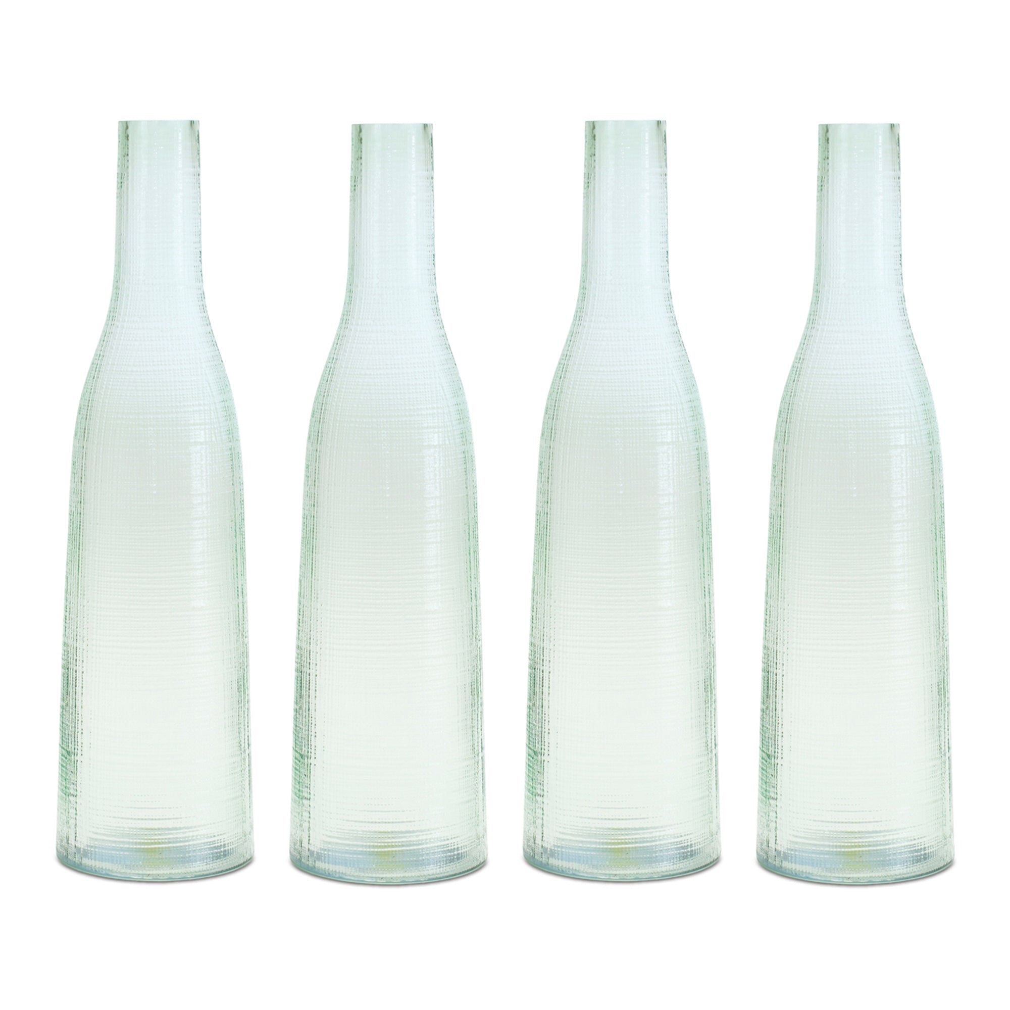 Give your home a unique touch with this beautiful set of Glass Vases from our latest collection. Its stunning green tones, stylish bottle shape, and ribbed design create a mid-century modern feel that will dazzle any interior. Perfect for displaying your fresh garden picks, this quality glass composition is sure to brighten any home. Add style and sophistication to your living space with Glass Vases., Vase (Set of 4) 4.75"D x 16.75"H Glass