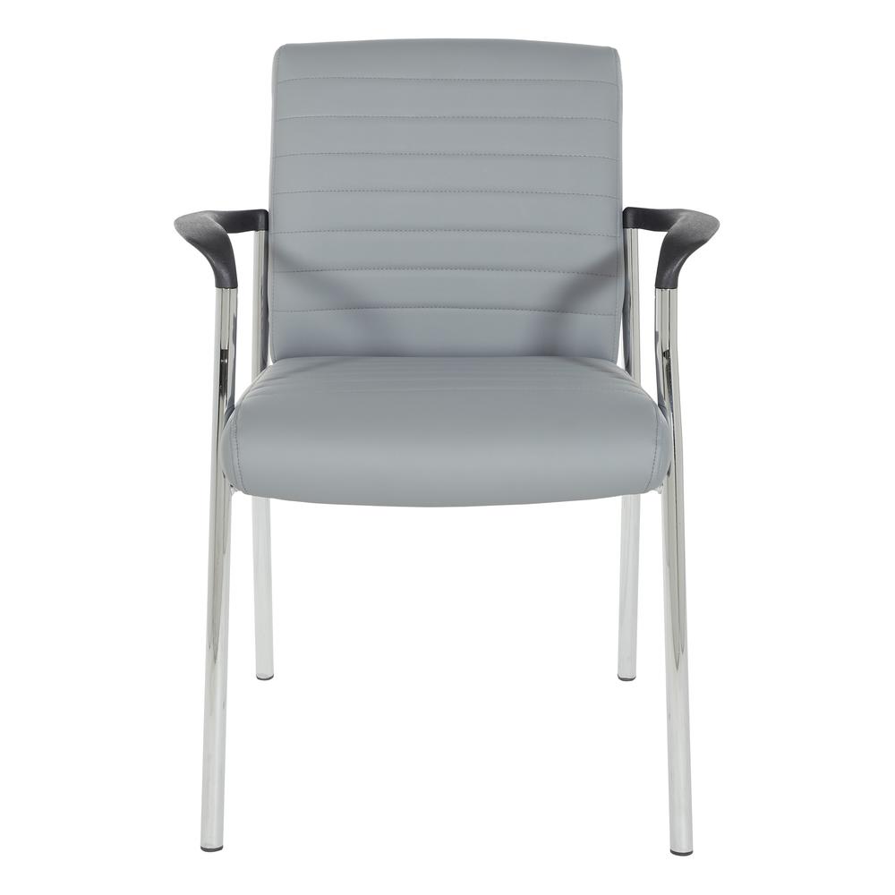 This Guest Chair in Grey Faux Leather with a Chrome Frame by Work Smart¨ is subtly contoured for true comfort. Its thick, padded seat and back are designed with built-in lumbar support and upholstered in a crisp, faux leather. A radial-style chrome frame adds style and stability to this versatile guest chair.