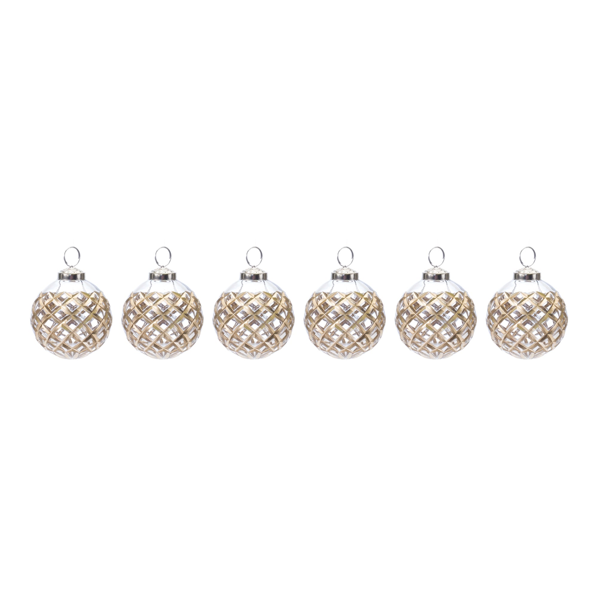 Adorn your Christmas Tree with this beautiful set of Harlequin Etched Glass Ball Ornaments. Featuring 6 pieces, this set's chic gold tones and etched harlequin design are the perfect combination to create a memorable display. The quality glass composition with brass ring hanger is sure to endure for seasons to come. Whether you're adding a touch of cheer to your home or gifting to a loved one, these ornaments will definitely bring smiles to your home. , Ball Ornament (Set of 6) 3"D Glass