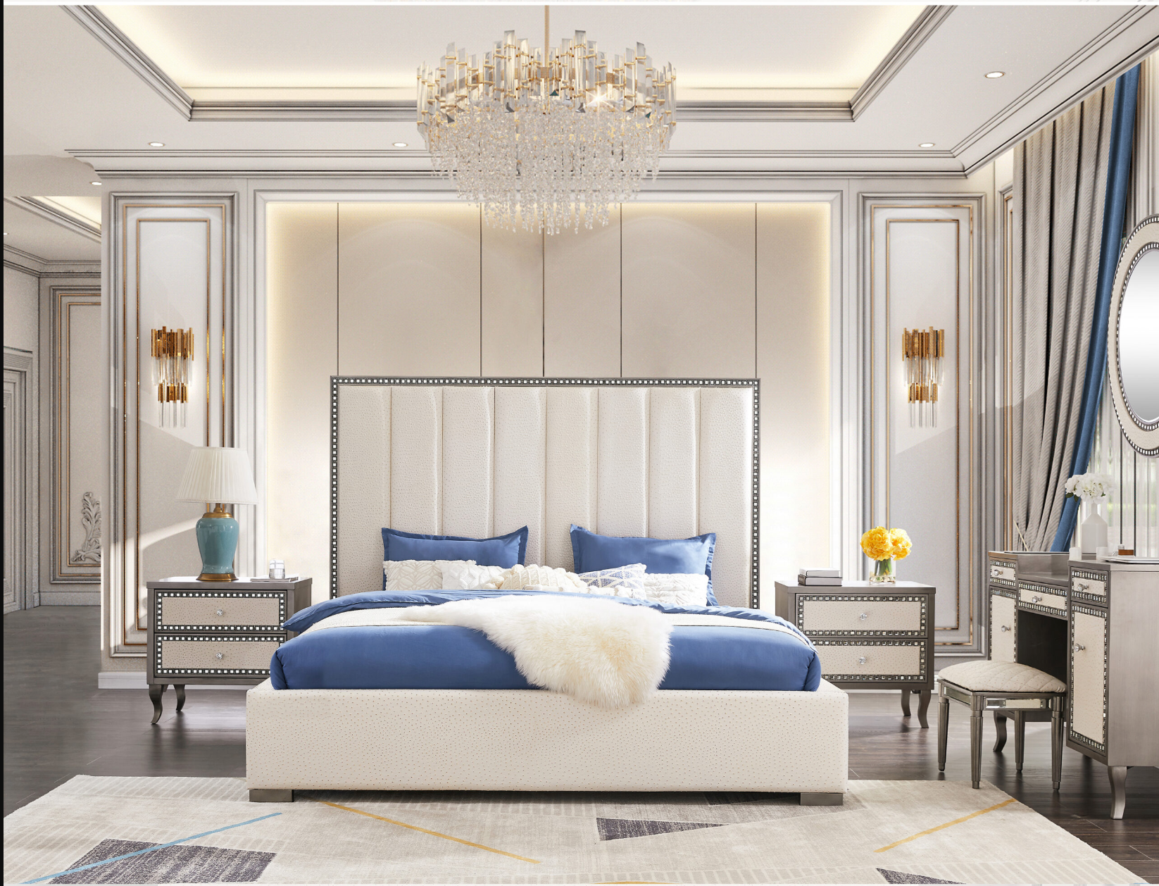 Dimensions: EK Bed: W82.7D88.6H70.5″ Nightstand: W27.6D19.7H27.6″ Dresser/Vanity: W60.4D19.3H34.2″ Mirror: DIA 39.4″