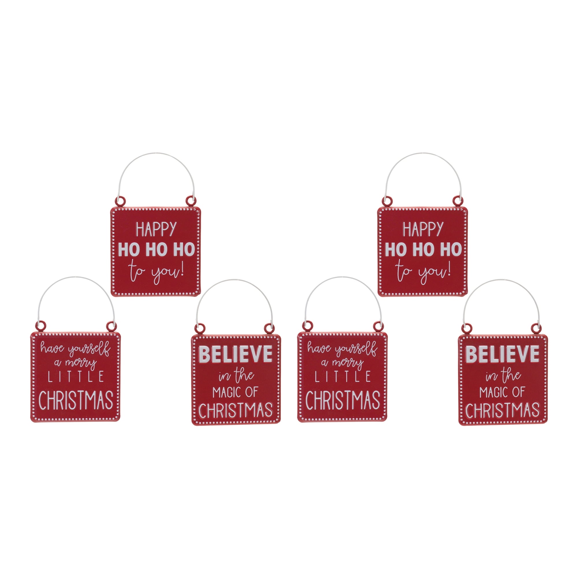 Add a traditional touch to your Christmas Tree with this beautiful set of Holiday Sentiment Ornaments. Featuring 6 pieces, this set's festive red tones, "Ho Ho Ho", "Merry Christmas" and "Beleive" sentiments, and wire hanging accents are the perfect combination to create a memorable display. The quality iron metal composition is sure to endure for seasons to come. Whether you're adding a touch of cheer to your home or gifting to a loved one, these ornaments will definitely bring smiles to your home. , Ornament (Set of 6) 7.75"H Iron