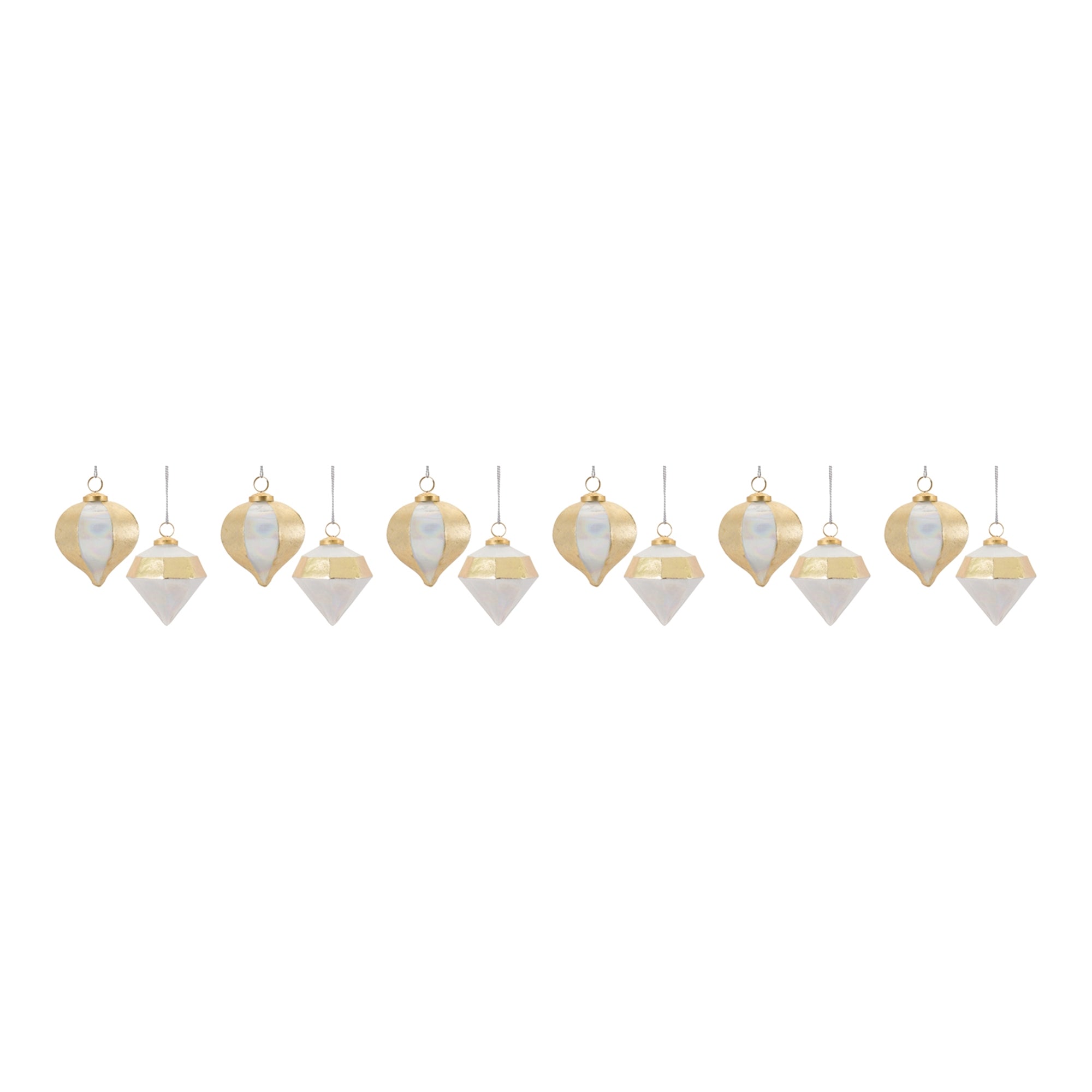 Adorn your Christmas tree and holiday decor with this stunning set of Irredescent Glass Ornamnets. Featuring 6 pieces, the chic gold and wintry tones paired with the irredescent design is the perfect combination to create a memorable display. The quality glass composition and delicate silver string hanging accent is sure to endure for seasons to come. Whether you're adding a touch of cheer to your home or gifting to a loved one, these ornaments will definitely bring smiles. , Ornament (Set of 6) 4"H, 4.5"H Glass