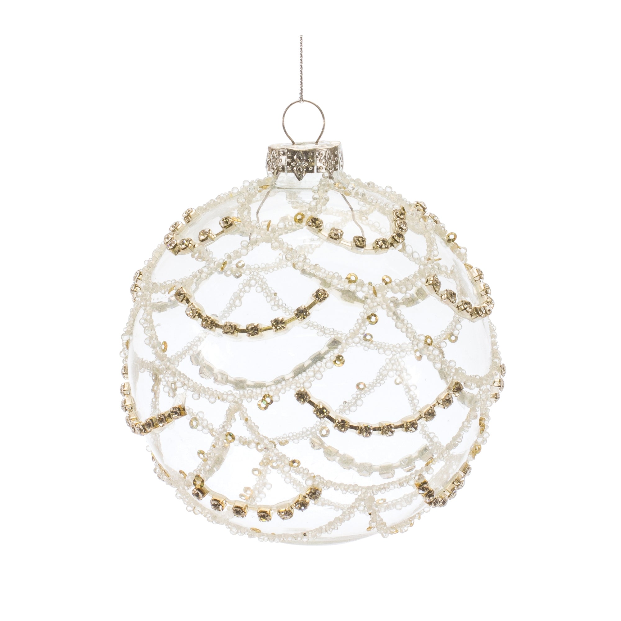 Adorn your Christmas tree and holiday decor with this stunning set of Jeweled Glass Ball Ornaments. Featuring 6 pieces, the wintry white tones paired with the jeweled design is the perfect combination to create a memorable display. The quality glass composition and delicate silver string hanging accent is sure to endure for seasons to come. Whether you're adding a touch of cheer to your home or gifting to a loved one, these ornaments will definitely bring smiles. , Ball Ornament (Set of 6) 4"D Glass