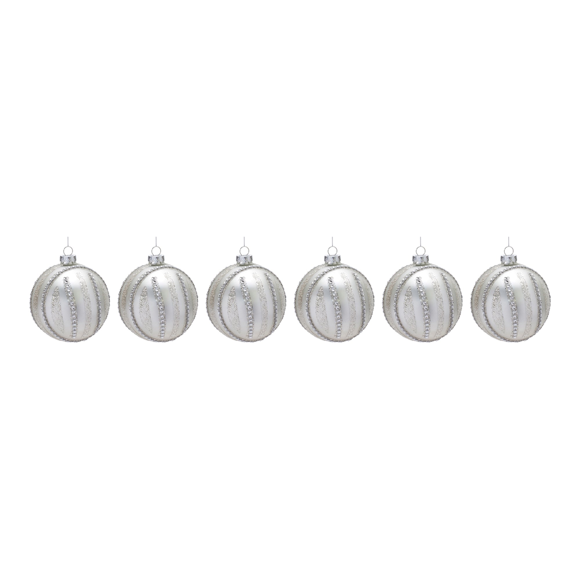 Adorn your Christmas tree and holiday decor with this stunning set of Jeweled Glass Ball Ornaments. Featuring 6 pieces, the chic silver tones paired with the jeweled design is the perfect combination to create a memorable display. The quality glass composition and delicate silver string hanging accent is sure to endure for seasons to come. Whether you're adding a touch of cheer to your home or gifting to a loved one, these ornaments will definitely bring smiles. , Ball Ornament (Set of 6) 4"D Glass
