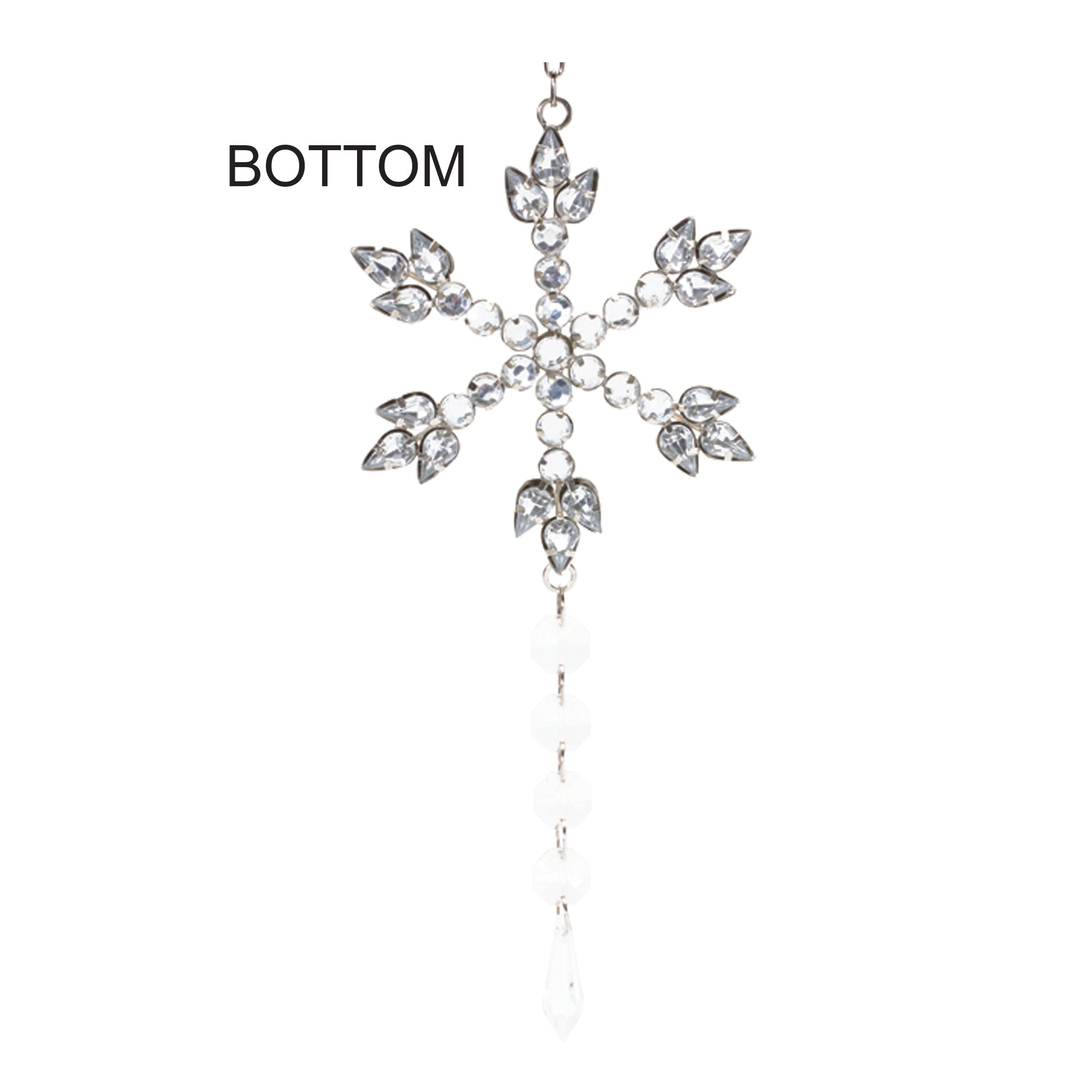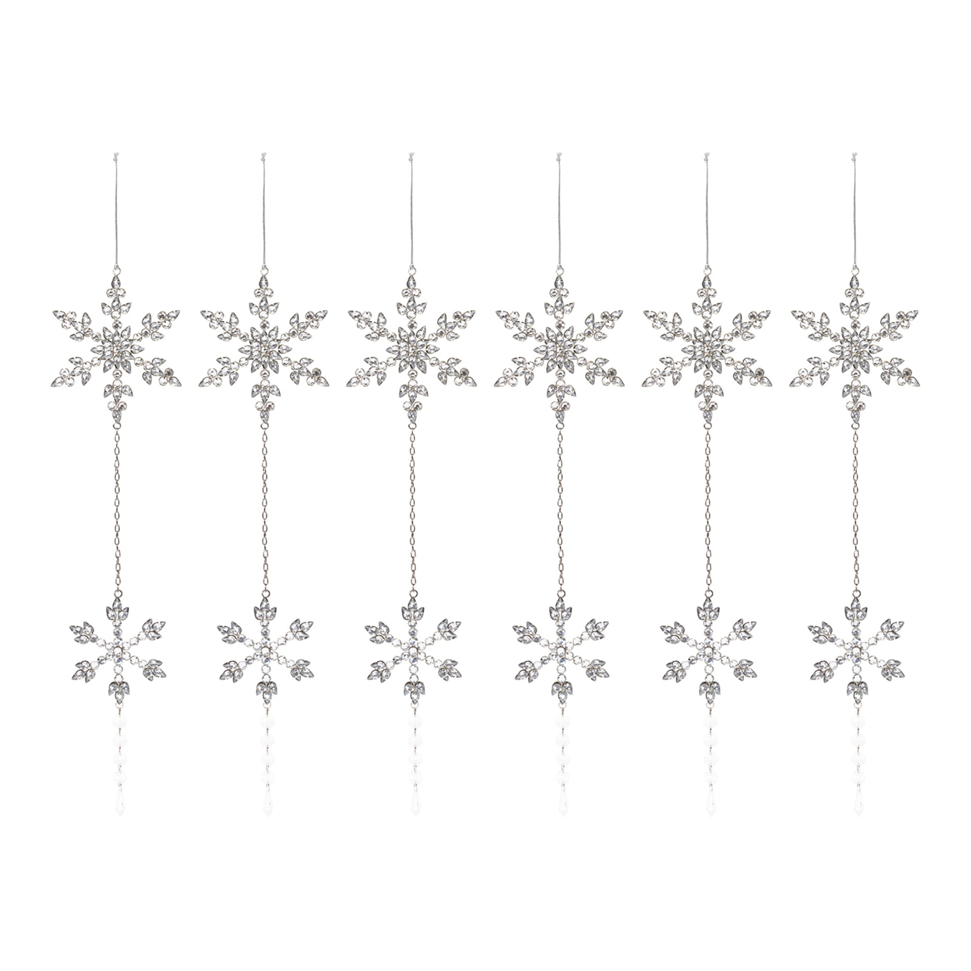 Add a chic touch to your Christmas Tree with this beautiful set of Jeweled Metal Snowflake Drop Ornaments. Featuring 6 pieces, this set's chic silver tones, glass jewel and beaded design, and traditional snowflake shape are the perfect combination to create a memorable display. The quality iron metal and glass jewel composition with delicate string hanger is sure to endure for seasons to come. Whether you're adding a touch of cheer to your home or gifting to a loved one, these ornaments will definitely bring smiles to your home. , Snowflake Drop Ornament (Set of 6) 21"H Iron/Glass