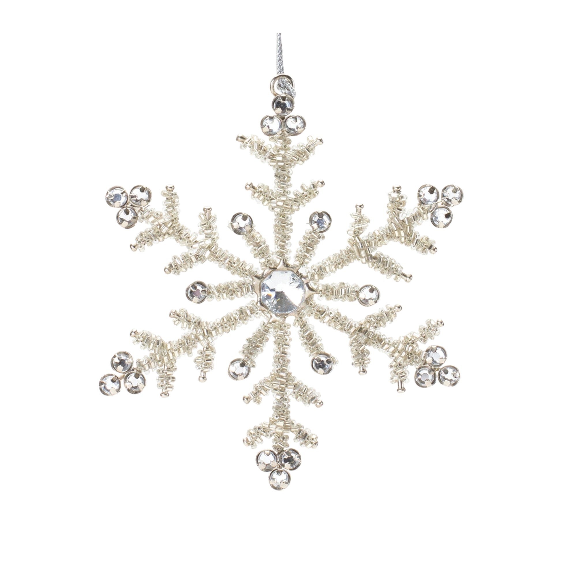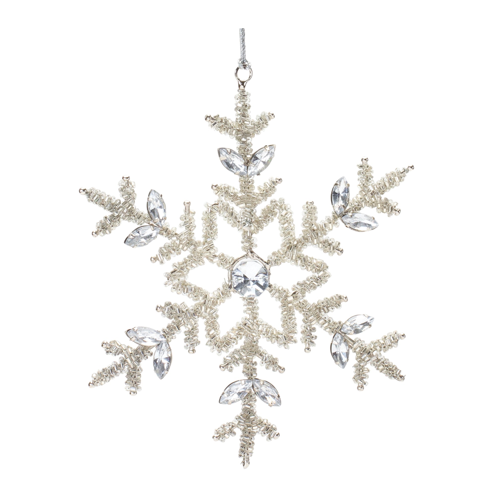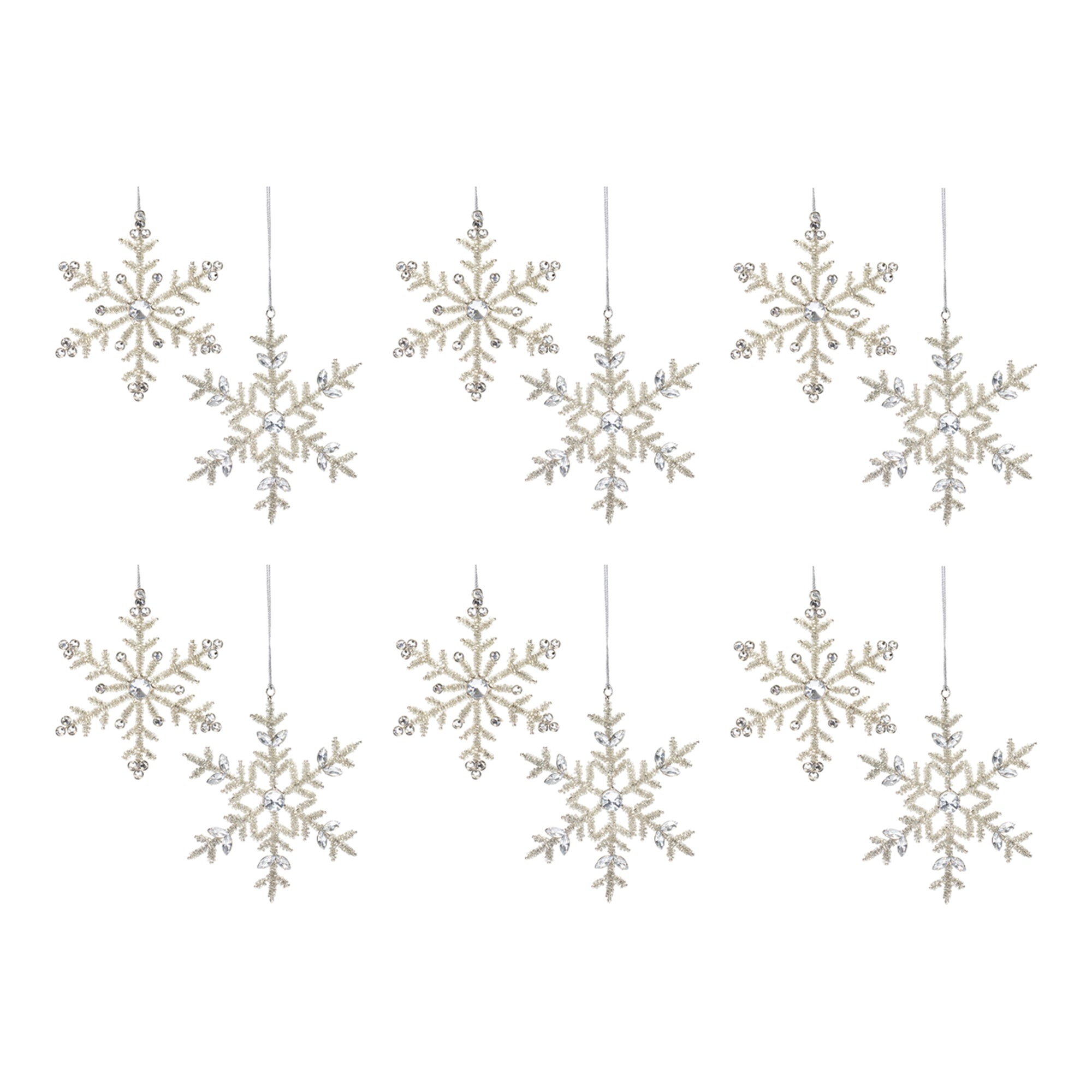 Add a chic touch to your Christmas Tree with this beautiful set of Jeweled Metal Snowflake Ornaments. Featuring 12 pieces, this set's wintry silver tones, traditional snowflake design, and glass jewel accents are the perfect combination to create a memorable display. The quality iron metal and glass jewel composition with silver string hanger is sure to endure for seasons to come. Whether you're adding a touch of cheer to your home or gifting to a loved one, these ornaments will definitely bring smiles to your home. , Snowflake Ornament (Set of 12) 5.25"H, 6"H Iron/Glass