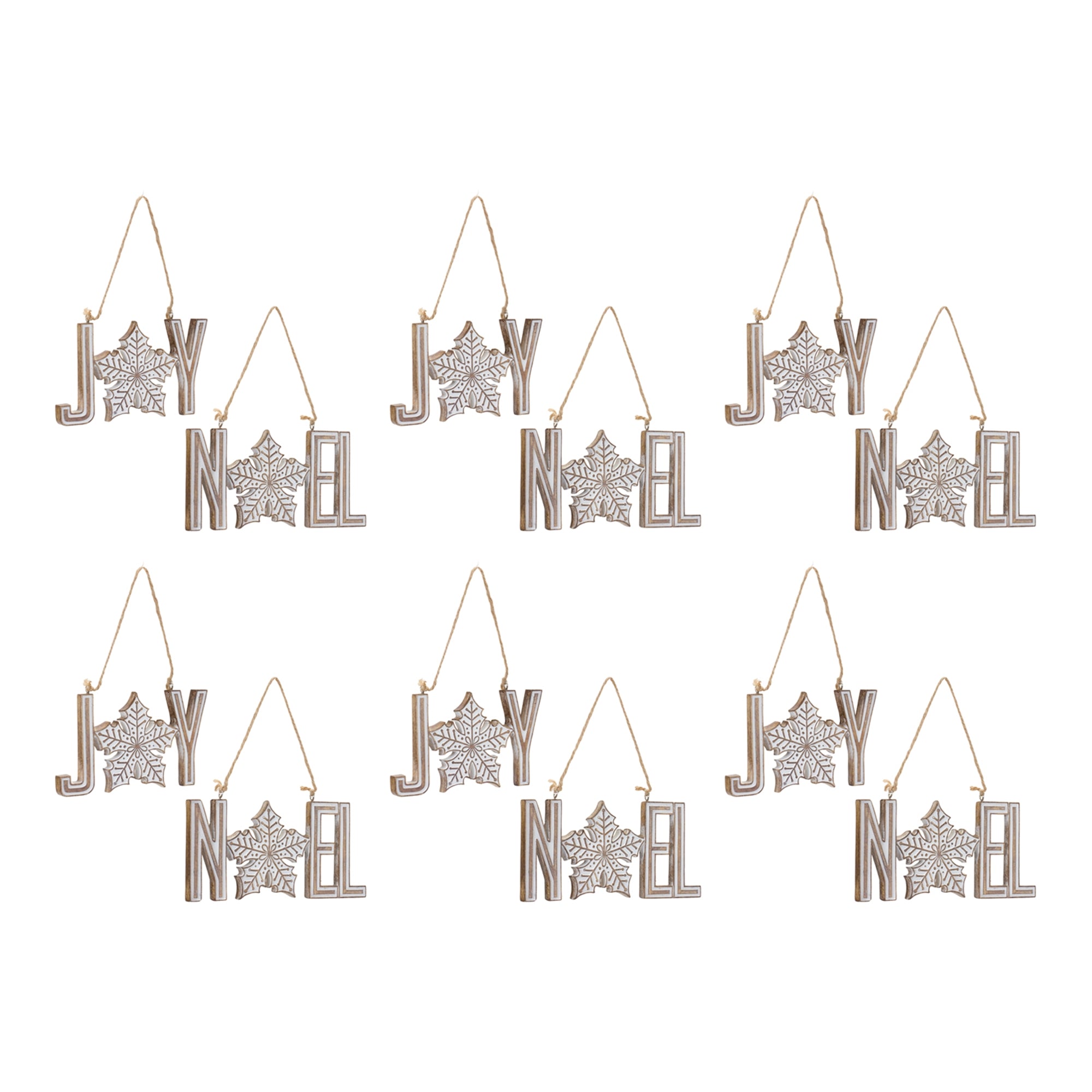 Get into the holiday spirit with this set of Joy and Noel Snowflake Ornaments! Whether you're adding a touch of cheer to your tree or gifting to a loved one, these ornaments will definitely bring smiles to your home. With neutral red and beige tones, white-washed wood design, snowflake letter accent, and a quality polyresin construction, these joyful decorations are sure to last for years to come! Add a little something special this holiday season with this memorable set of ornaments., Joy and Noel Ornament (Set of 12) 3"H, 3.5"H Resin