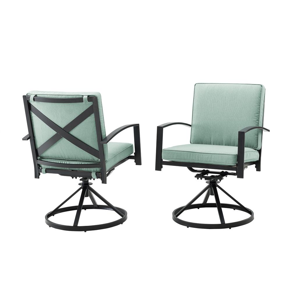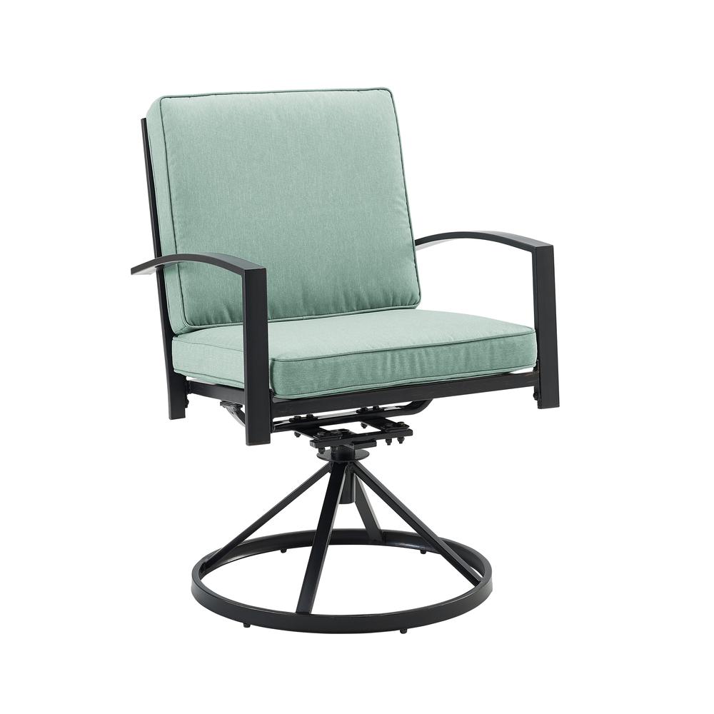 Outdoor dining is fashionable and fun with the Kaplan 2pc Swivel Dining Chair Set. The weather-resistant steel provides a sturdy framework for the 360-degree swivel base, creating a perfect companion to your outdoor dining table or seating area. The combination of comfortable, cushioned seats with a transitional design makes these outdoor chairs a welcome addition to your outdoor retreat.