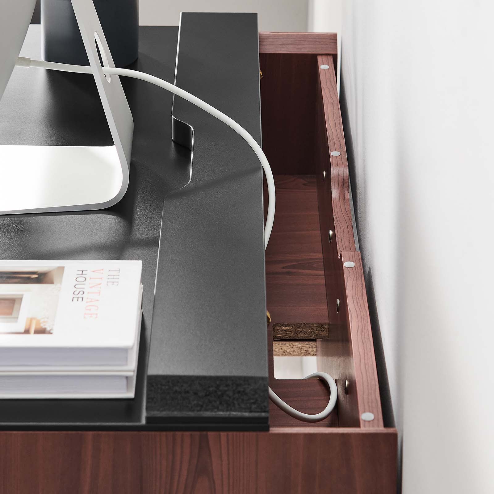 • Bullets: Wall-Mount Office Desk Flip-Up Cable Management Compartment Particleboard and Melamine Construction Assembly Required Weight Capacity: 130 lbs.