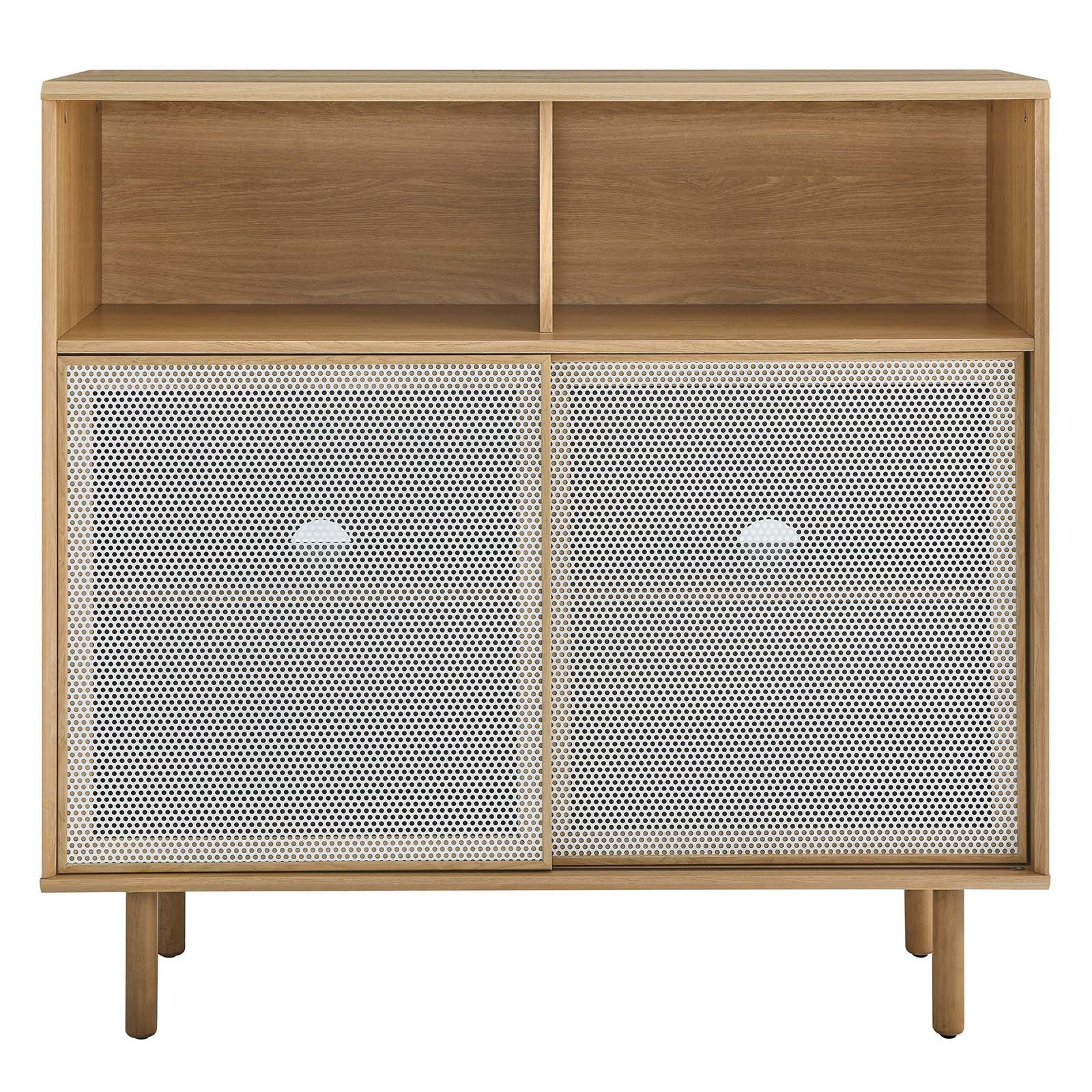 Bring urban flare to your living space with the modern design of the Kurtis 47" Display Cabinet. Featuring sliding metal mesh doors, this storage cabinet brings industrial design to a living room, lounge area, home office, or hallway. This versatile display cabinet is crafted from MDF and particleboard with a natural wood grain design. Offering ample storage space for media essentials, linens, dŽcor, or anything else that suits your needs, this sideboard features open shelving areas partially concealed by mesh sliding doors allowing for both storage and display. Resting on sturdy wood legs with non-marking felt pads to protect flooring, this sideboard doubles as a high TV stand that can accommodate TVs up to 52 inches. Assembly required. Weight Capacity: 181 lbs. Set Includes: One - Kurtis 47" Display Cabinet