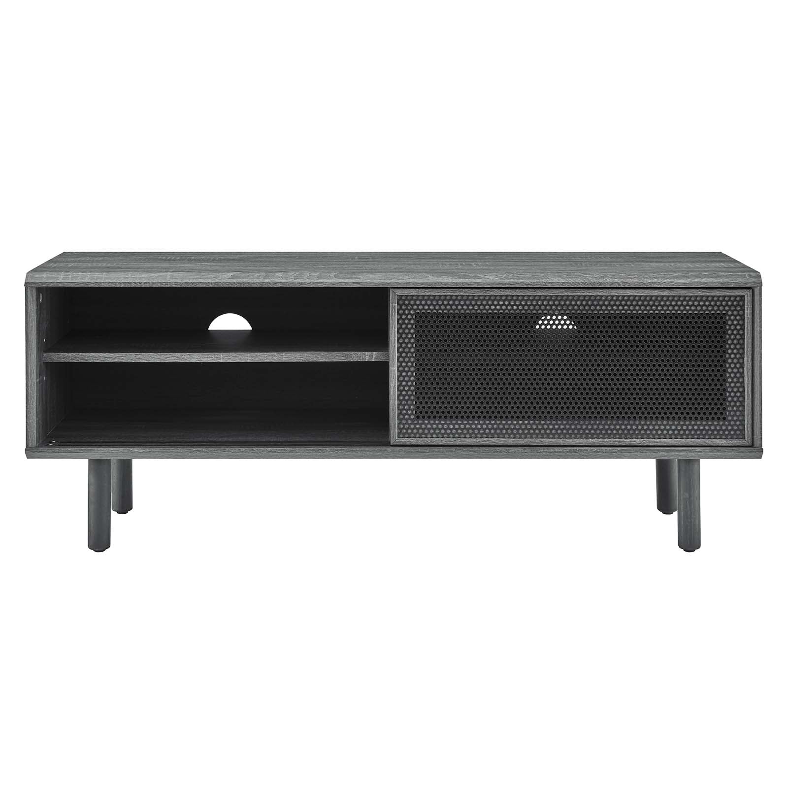 Bring urban flare to your living space with the modern design of the Kurtis 47" TV Stand. Featuring sliding metal mesh doors, this entertainment center brings industrial design to the living room, bedroom, home office, or lounge area. This media stand is crafted from MDF and particleboard with a natural wood grain design. Offering ample storage space for all your media essentials, this TV console features an open shelving area concealed by mesh sliding doors with cable management holes that keep things organized and allow for flow through ventilation. Resting on sturdy wood legs with non-marking foot pads to protect flooring, this low-profile TV stand accommodates flat screen TVs up to 52 inches. Assembly required. Weight Capacity: 137 lbs. Set Includes: One - Kurtis 47" TV Stand