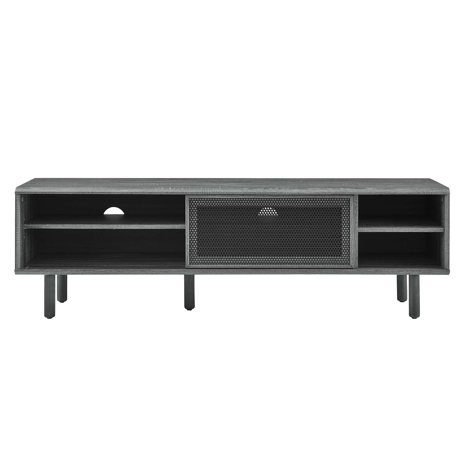 Bring urban flare to your living space with the modern design of the Kurtis 60" TV Stand. Featuring sliding metal mesh doors, this entertainment center brings industrial design to the living room, bedroom, home office, or lounge area. This media stand is crafted from MDF and particleboard with a natural wood grain design. Offering ample storage space for all your media essentials, this TV console features an open shelving area concealed by mesh sliding doors with cable management holes that keep things organized and allow for flow through ventilation. Resting on sturdy wood legs with non-marking foot pads to protect flooring, this low-profile TV stand accommodates flat screen TVs up to 65 inches. Assembly required. Weight Capacity: 200 lbs. Set Includes: One - Kurtis 60" TV Stand