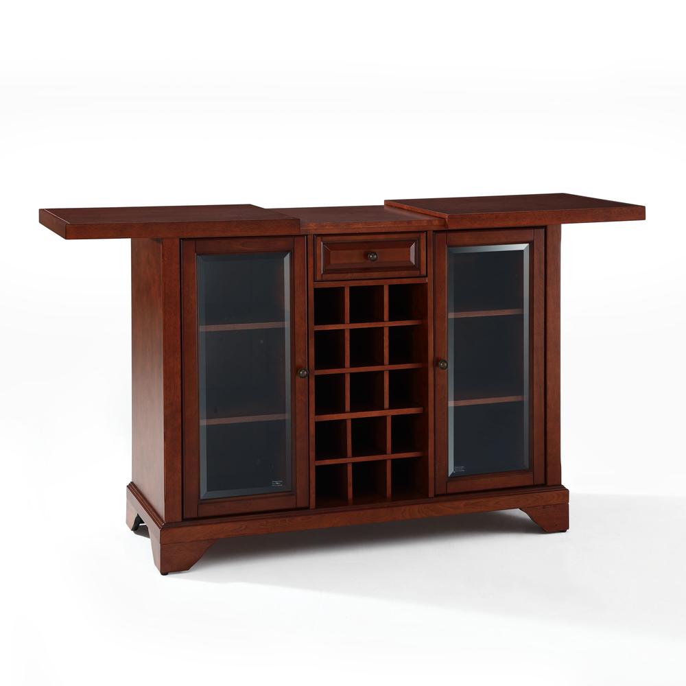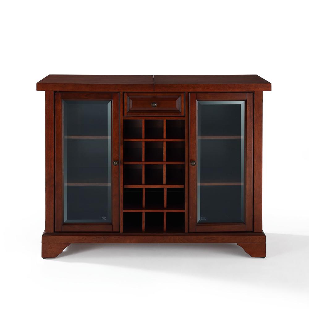 Elegantly entertain guests with the Lafayette Sliding Top Bar. Beautiful, beveled glass doors and sculpted feet add classic style, while the versatile sliding top provides extra serving space. Behind the glass doors, adjustable shelves offer plentiful storage space for spirits and barware. The removable center wine rack holds up to 15 bottles of wine. Make at home entertaining a breeze with the Lafayette Sliding Top Bar.